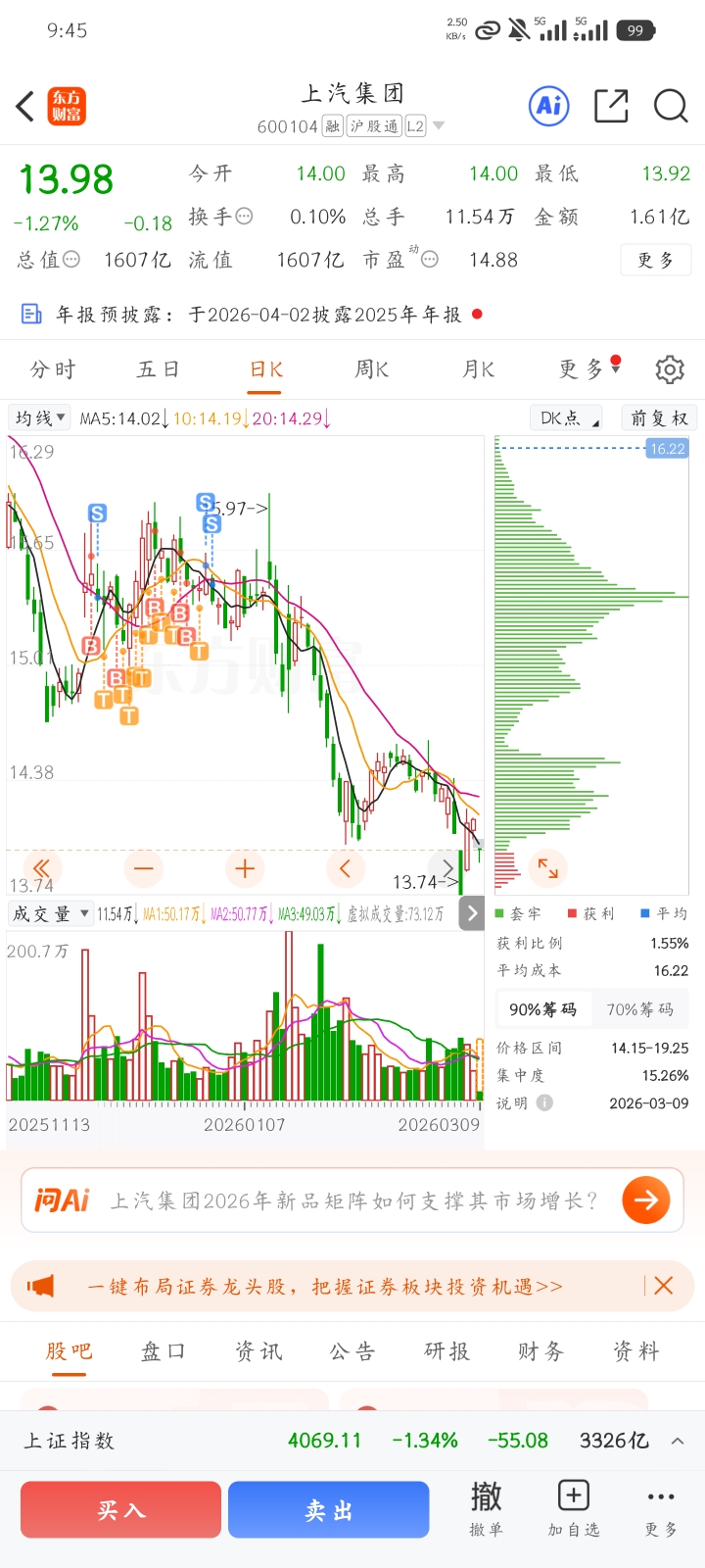 曾经我也非常喜欢上汽集团,但是我全仓一个月都没有涨,那时候有调入中证指数的利好。