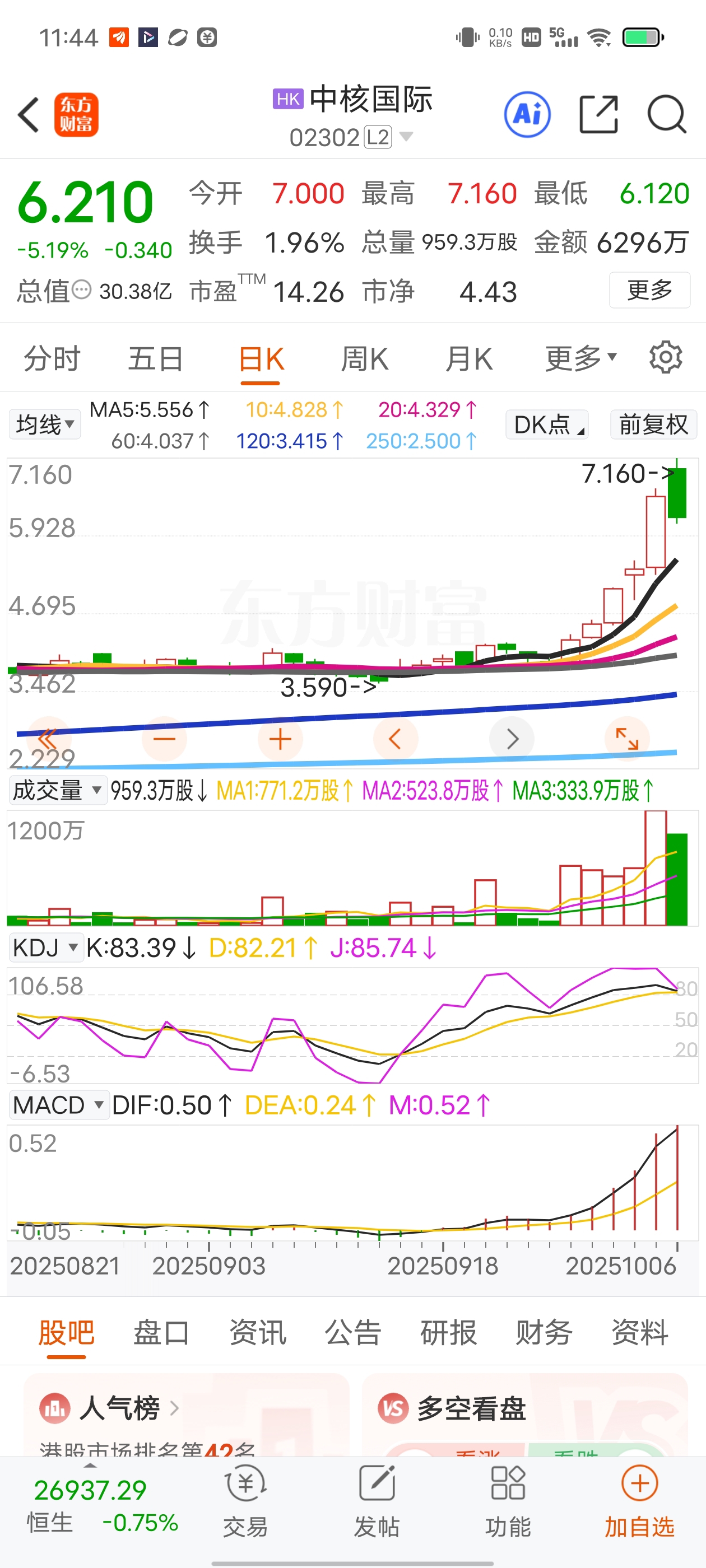 香港中核国际连涨五天大阳才调一天!骗筹码的假空苟,没筹码急!