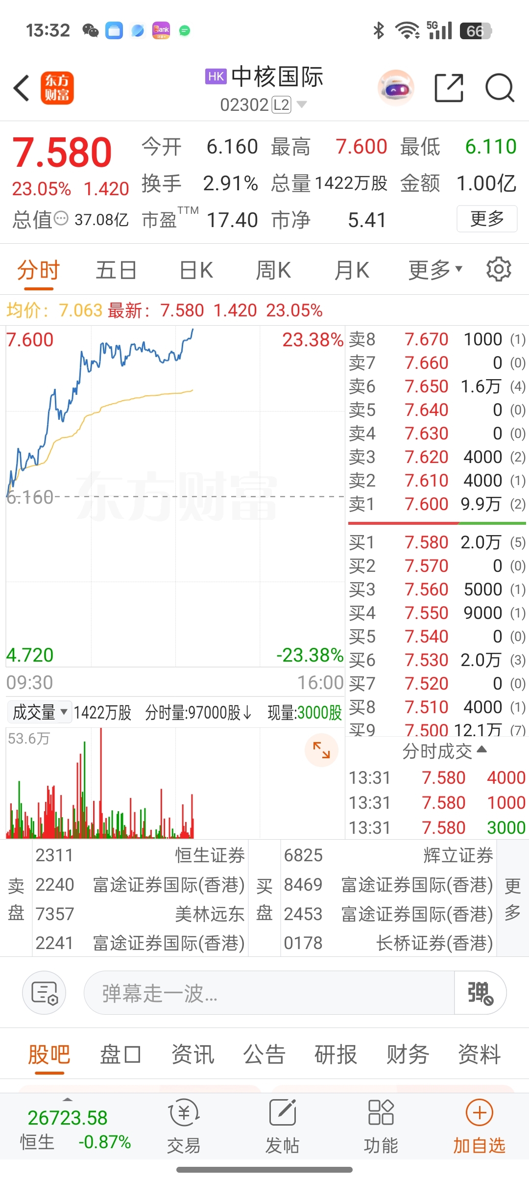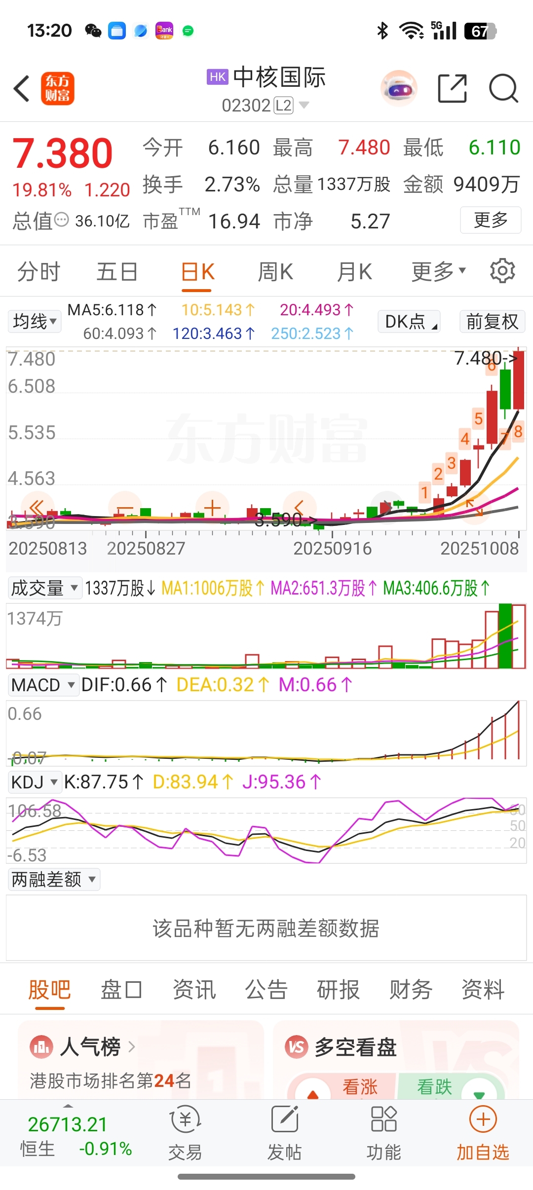 市场作出正面反应1美国核电创历史新高2港股中核国际七天六阳涨帽近90%,今日港股调整仍然逆势大涨23%;