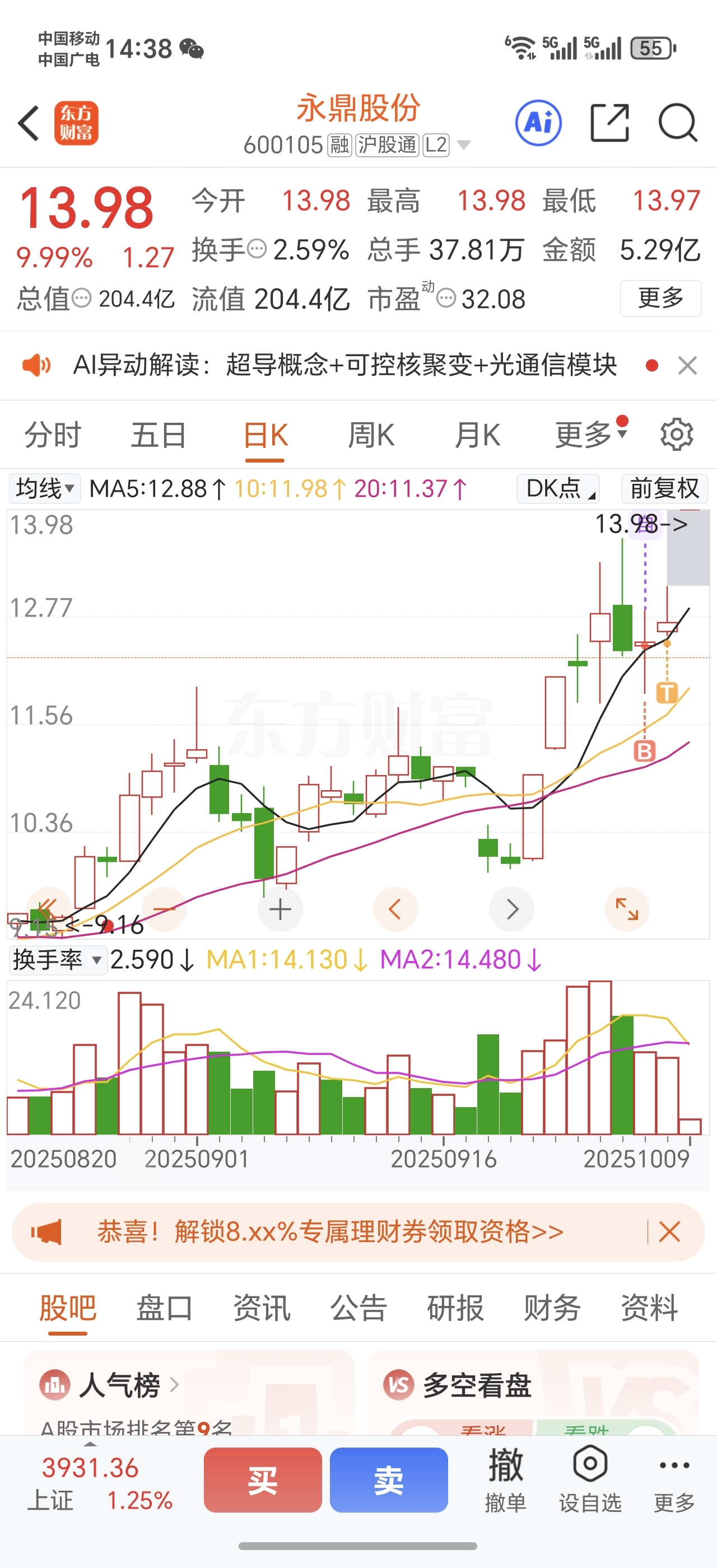 $永鼎股份(SH600105)$ 不是9.25前买的,主力怎么还会给机会,竞价为什么不直接大单封死,就是大哥想多拿点筹码。