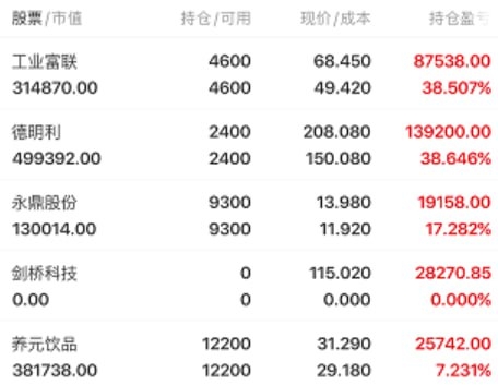 永鼎股份、养元饮品、今天的表现可圈可点,剑桥科技集合竞价时间情绪有变选择获利出局,把握节后的市场动向,才能做到进退有度,前期板块轮动过快,对个股冲击很大,很多个股出现调整,连板情绪比较明显,市场需要调整个股也不例外,所提标的每天都在实时观察,也会在评论区叙说,有不同观点的朋友欢迎讨论,最近的操作相信很多一路支持的老铁有目共睹;从来不马后炮,如有质疑可持续验证也可爬楼观看,话语过激者不回怼不对骂请文明沟通,在此祝所有老铁投资顺利股市长虹。#社区牛人计划#