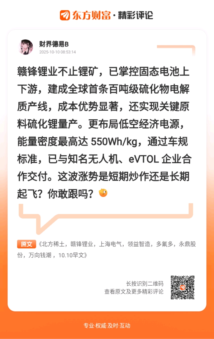 赣锋锂业:全球锂龙头!唯一掌握三种提锂技术,趋势没坏,赣锋锂业不用多讲,全球锂行业的 “老大哥”,最牛的是它是唯一掌握三种提锂技术的企业,不管是盐湖提锂、锂云母提锂还是锂辉石提锂,它都玩得转,产业链垂直整合优势没谁了。最近走的是标准趋势票行情,涨的时候稳、跌的时候缩量,没出现大起大落,说明资金认可度高。
