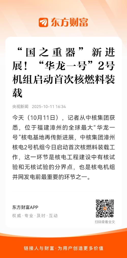 今天(10月11日),记者从中核集团获悉,位于福建漳州的全球最大“华龙一号”核电基地再传新进展,中核集团漳州核电2号机组今日启动首次核燃料装载工作,这一环节是核电工程建设中有核试验和无核试验的分界点,也是核电机组并网发电前最重要的环节之一。