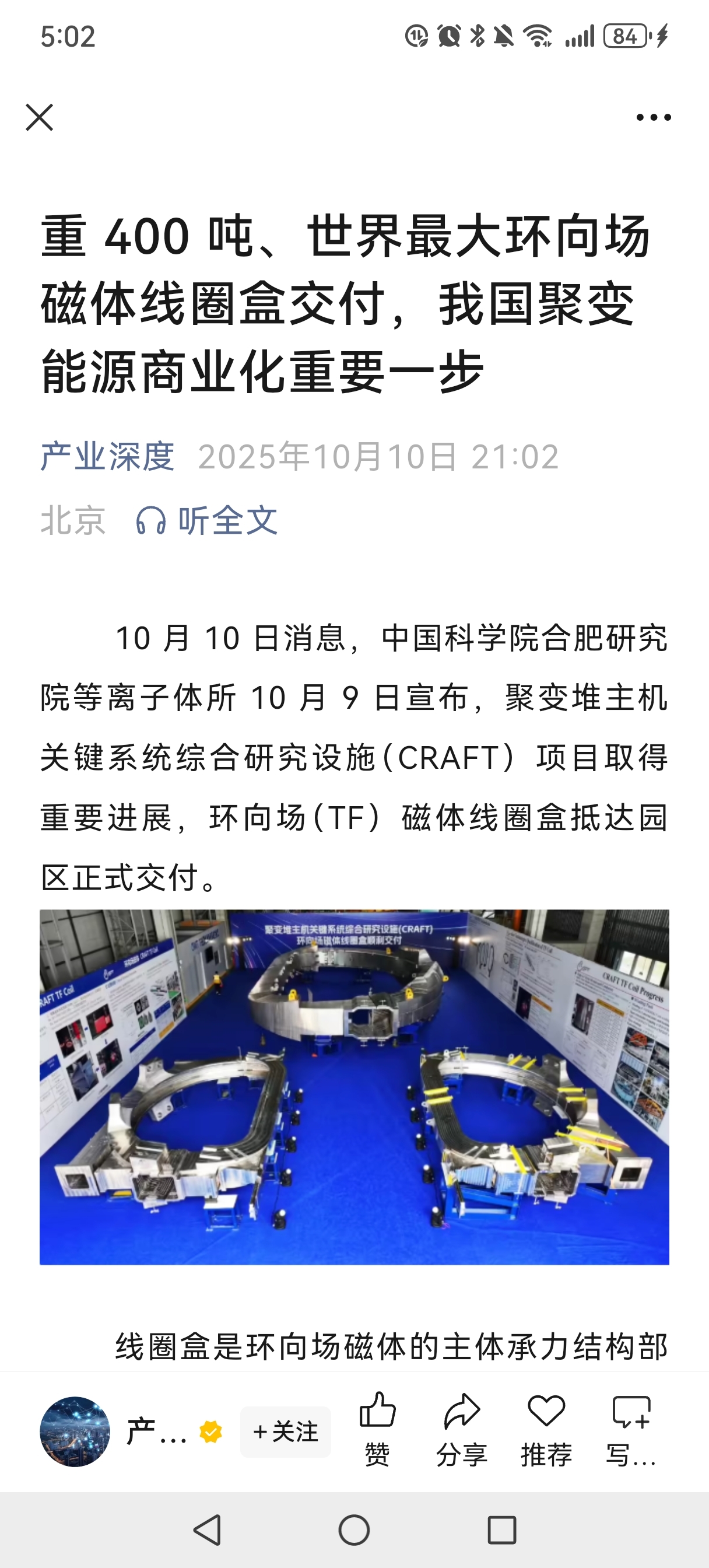 10 月 10 日消息,中国科学院合肥研究院等离子体所 10 月 9 日宣布,聚变堆主机关键系统综合研究设施(CRAFT)项目取得重要进展,环向场(TF)磁体线圈盒抵达园区正式交付。