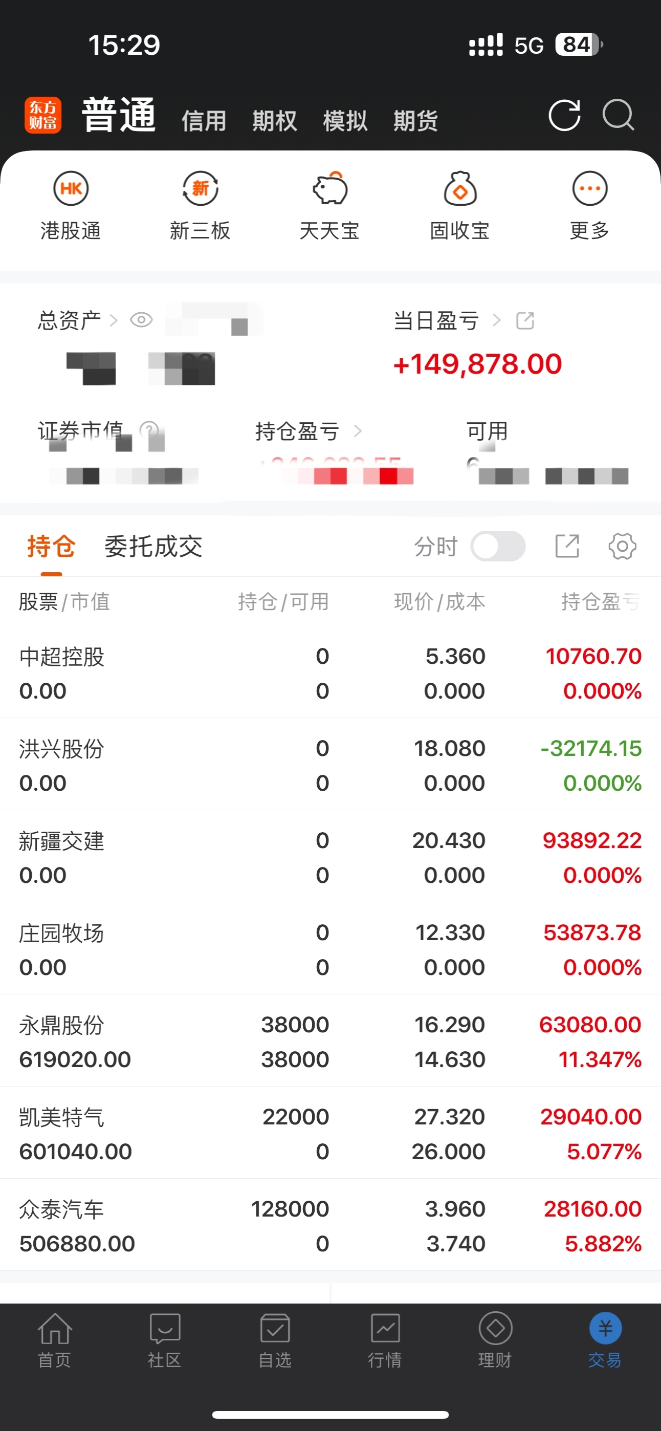 持有的中超控股,洪兴股份,新疆交建,庄园牧场今天安稳入袋了