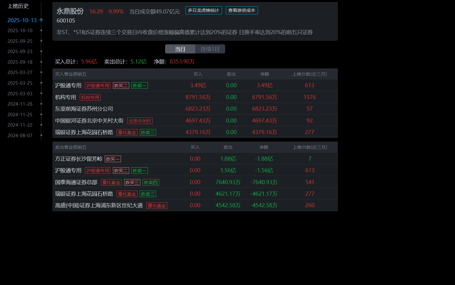 永鼎股份今日游资龙虎榜席位上榜数据如下!