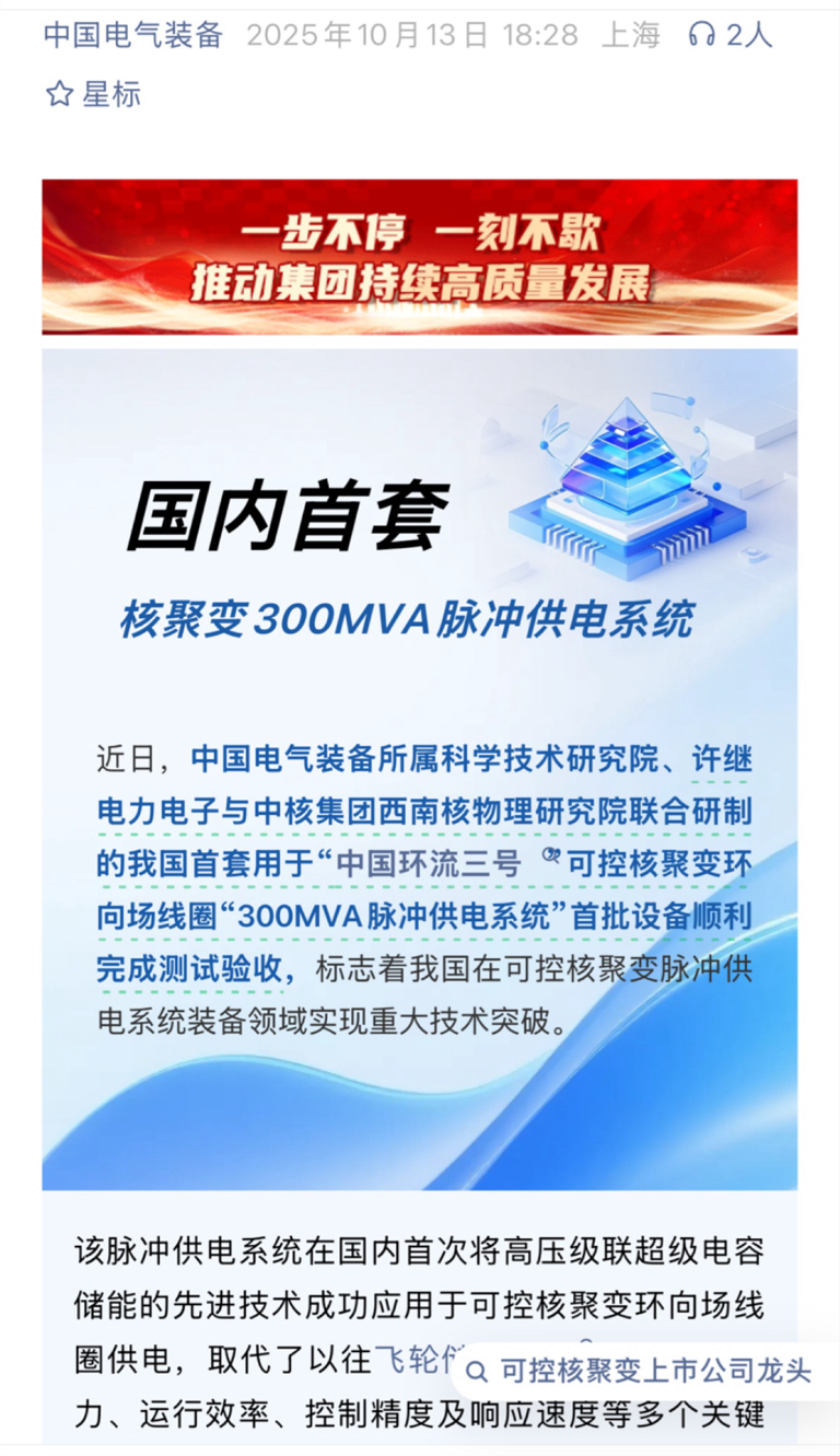 $永鼎股份(SH600105)$ 国内首套!中国电气装备成功研制核聚变300MVA脉冲供电系统!
