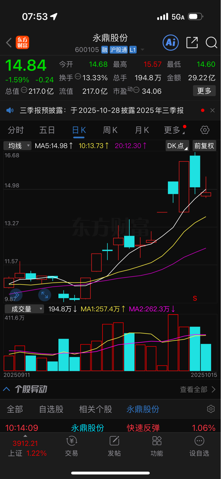 $永鼎股份(SH600105)$ 目前上升趋势还在但今天不好在跌否则上升趋势变下跌趋势了今天很关健