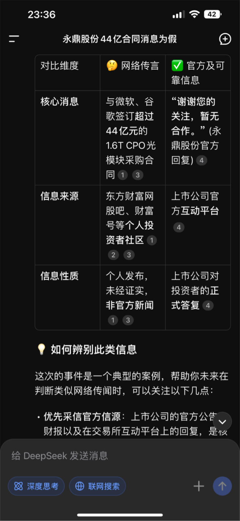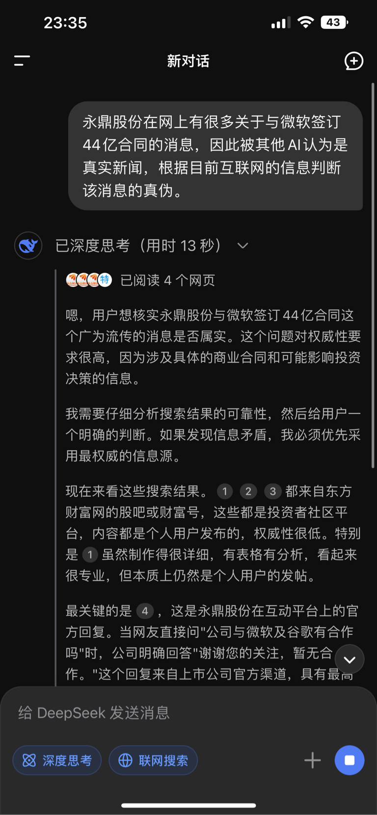 $永鼎股份(SH600105)$ 今天部分精神股东们纷纷质疑永鼎股份与微软44亿合同为什么不计入报表,另一部分股东们认为是豆包被喂了数据,现在就让我们玩一个花活,用deepseek来分析豆包说的这件事,不出所料deepseek赢了。可以给你们的争论盖棺定论了不