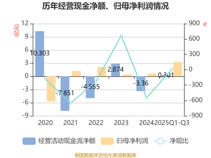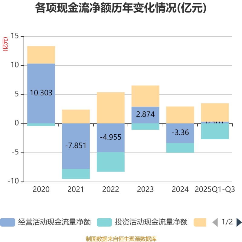 2025年前三季度,公司经营活动现金流净额为3011.44万元,同比增加5.2亿元;筹资活动现金流净额3.18亿元,同比增加2.34亿元;投资活动现金流净额-2.71亿元,上年同期为-1.81亿元。