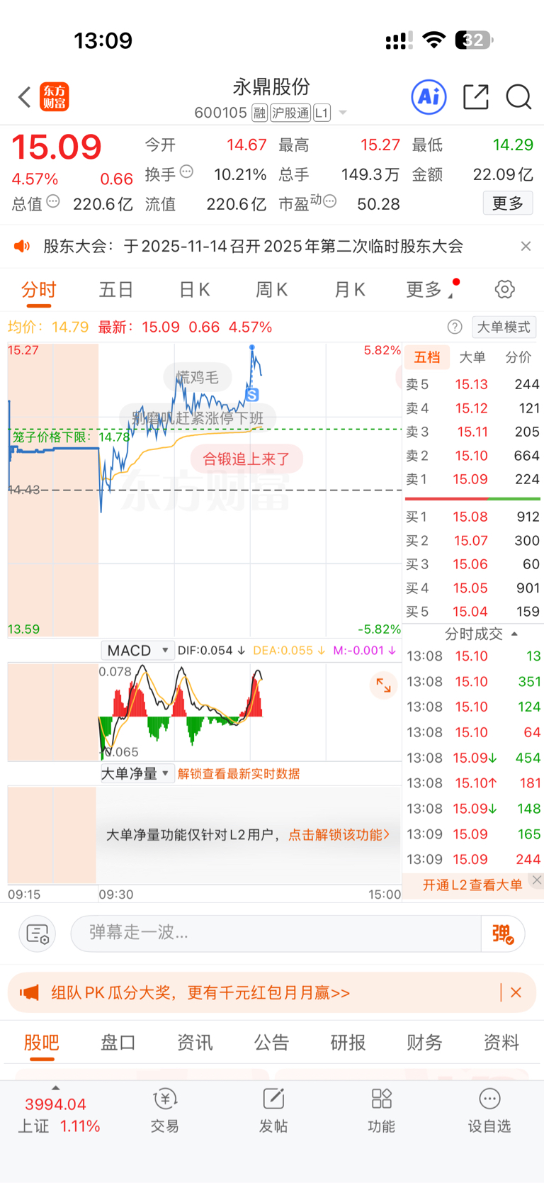 $永鼎股份(SH600105)$ 赚了20多个点走了,留下发财