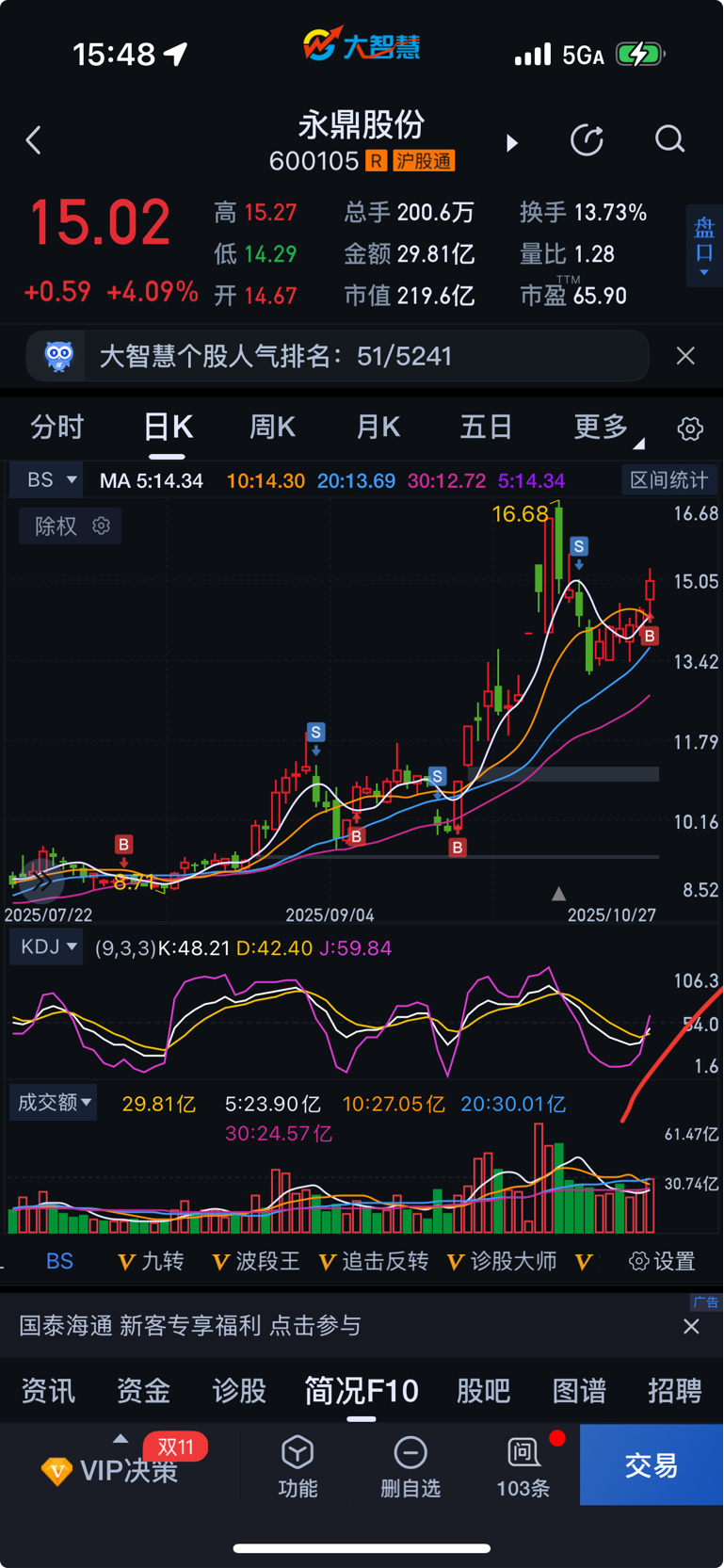 $永鼎股份(SH600105)$ k D j今天向上金叉,短期调整到位向上趋势近期但前提高点有压力
