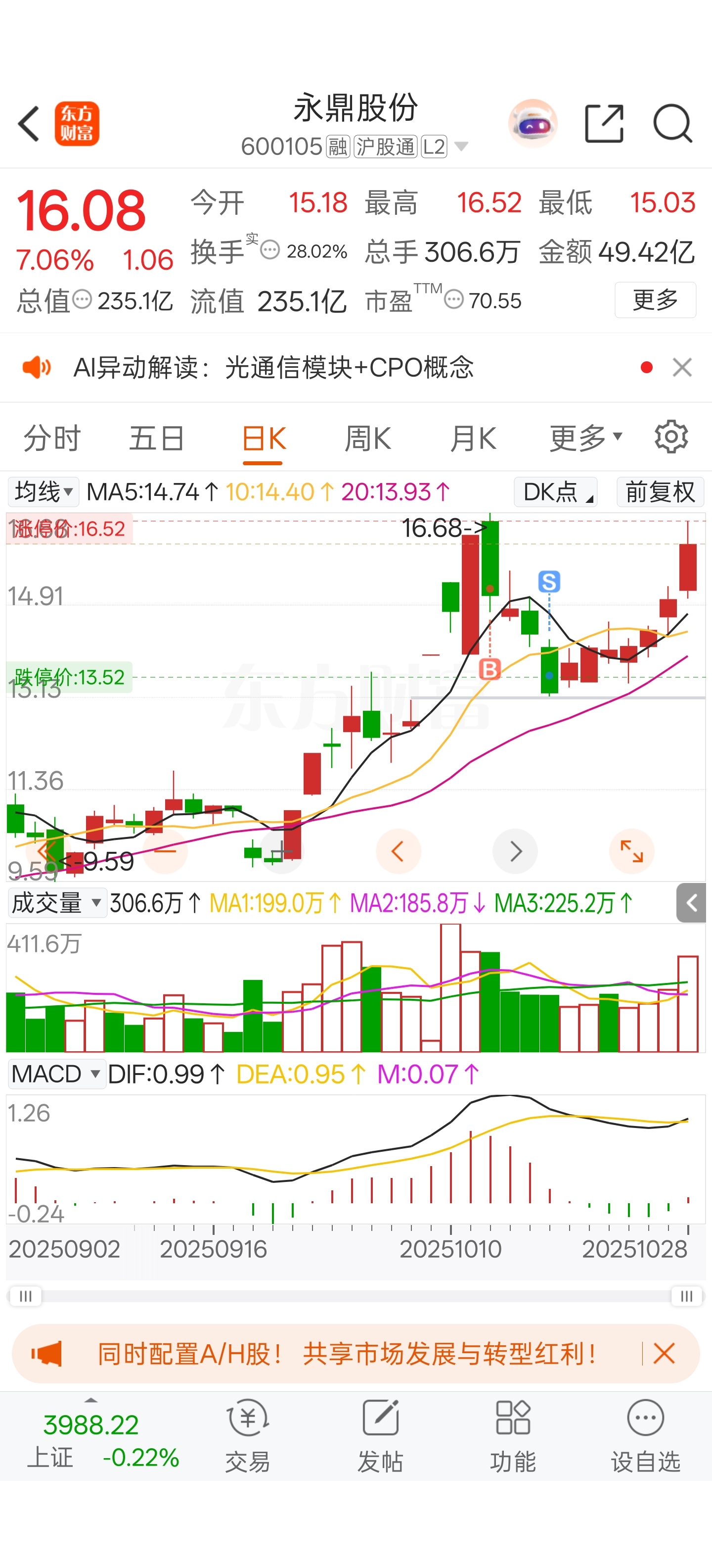 $永鼎股份(SH600105)$ 一买就跌,连跌四天。一卖就涨,而且是天天涨,