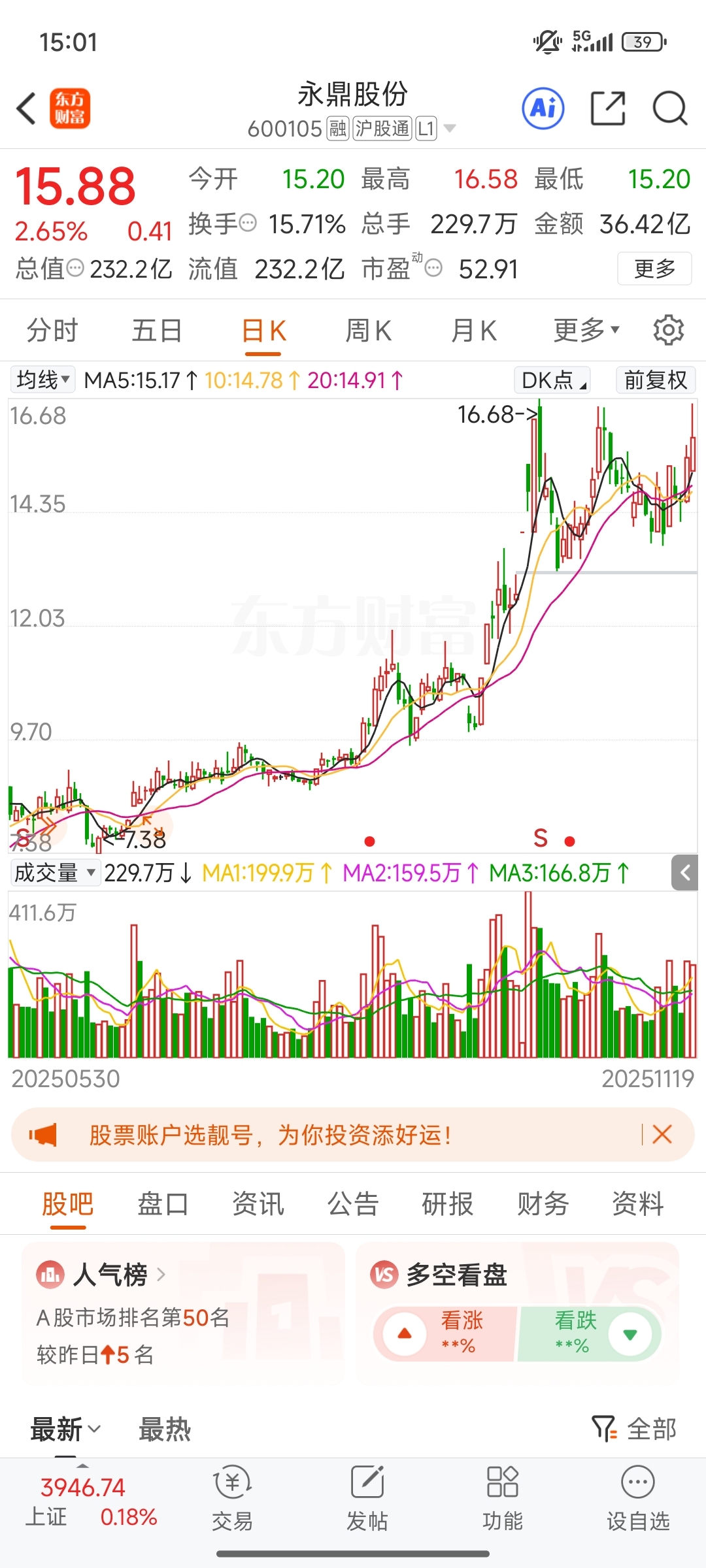 $永鼎股份(SH600105)$ 大家都在想,到底是出货还是洗盘呢?要知道一支股票里埋伏的不是一个庄,通常从建仓,吸筹,震仓,拉伸,一般都需要大半年甚至是一年多,妖股除外。把时间线拉长半年,翻了2倍,把时间线拉长1年,翻了4倍,所以你知道是出货还是洗盘了嘛