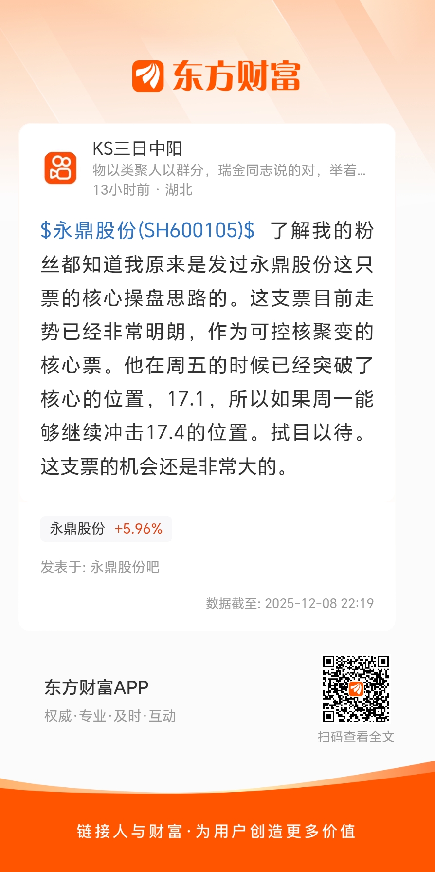 $永鼎股份(SH600105)$ 了解我的粉丝都知道我原来是发过永鼎股份这只票的核心操盘思路的。这支票目前走势已经非常明朗,作为可控核聚变的核心票。他在周五的时候已经突破了核心的位置,17.1,所以如果周一能够继续冲击17.4的位置。拭目以待。这支票的机会还是非常大的。