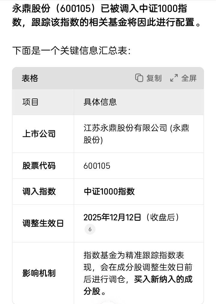 超级大利好!永鼎下周一正式进入中证1000指数名单,参考下图。所有中证1000指