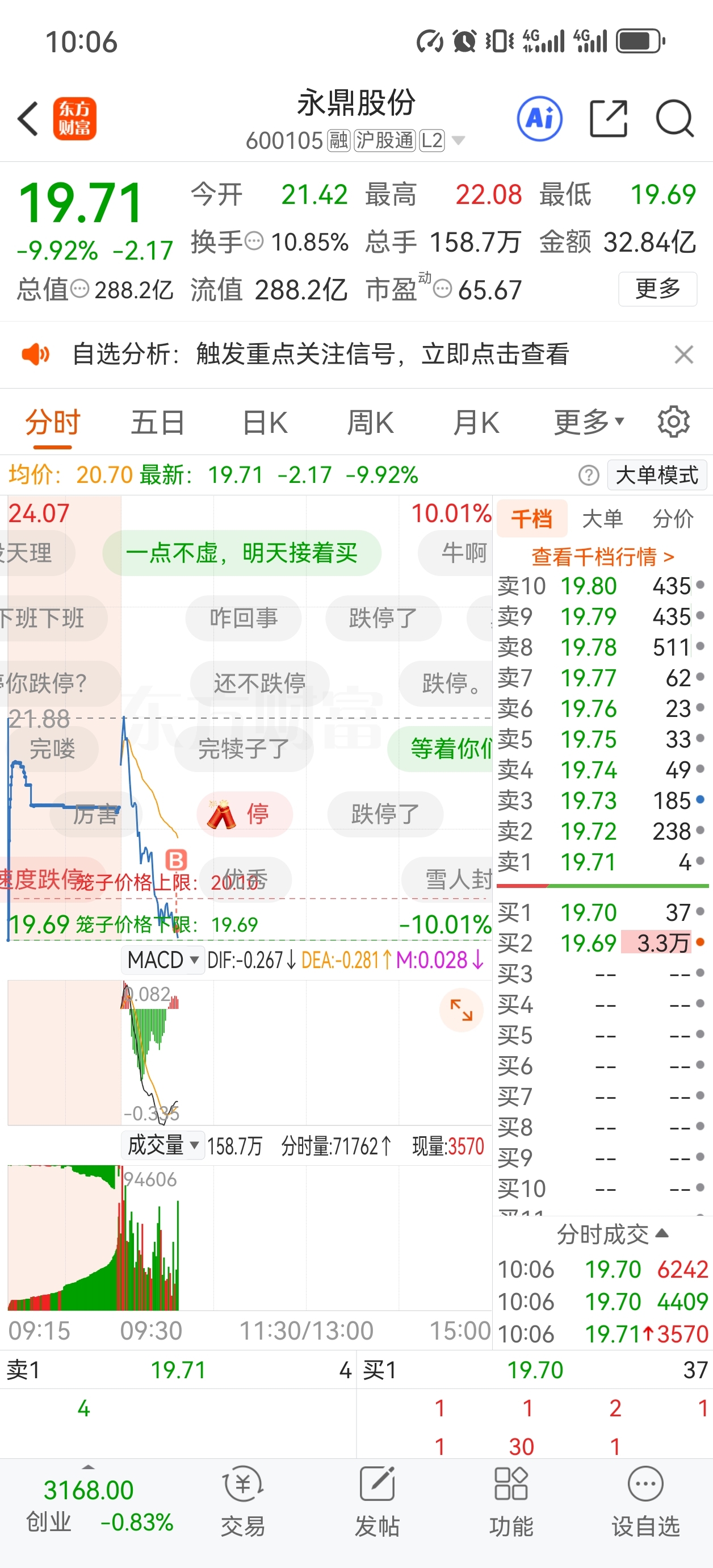 $永鼎股份(SH600105)$ 上周五尾盘集合竞价翘了一毛五是机构提前拿底仓了,今天调入中证1000生效,基金要被动买入。所以有先手的机构在猛砸,我30多个点的利润垫底,今天卖了领益智造,19.8又加了一倍,现在砸这样也没必要再卖了,我再拿两天,到周三如果不破前高我再出
