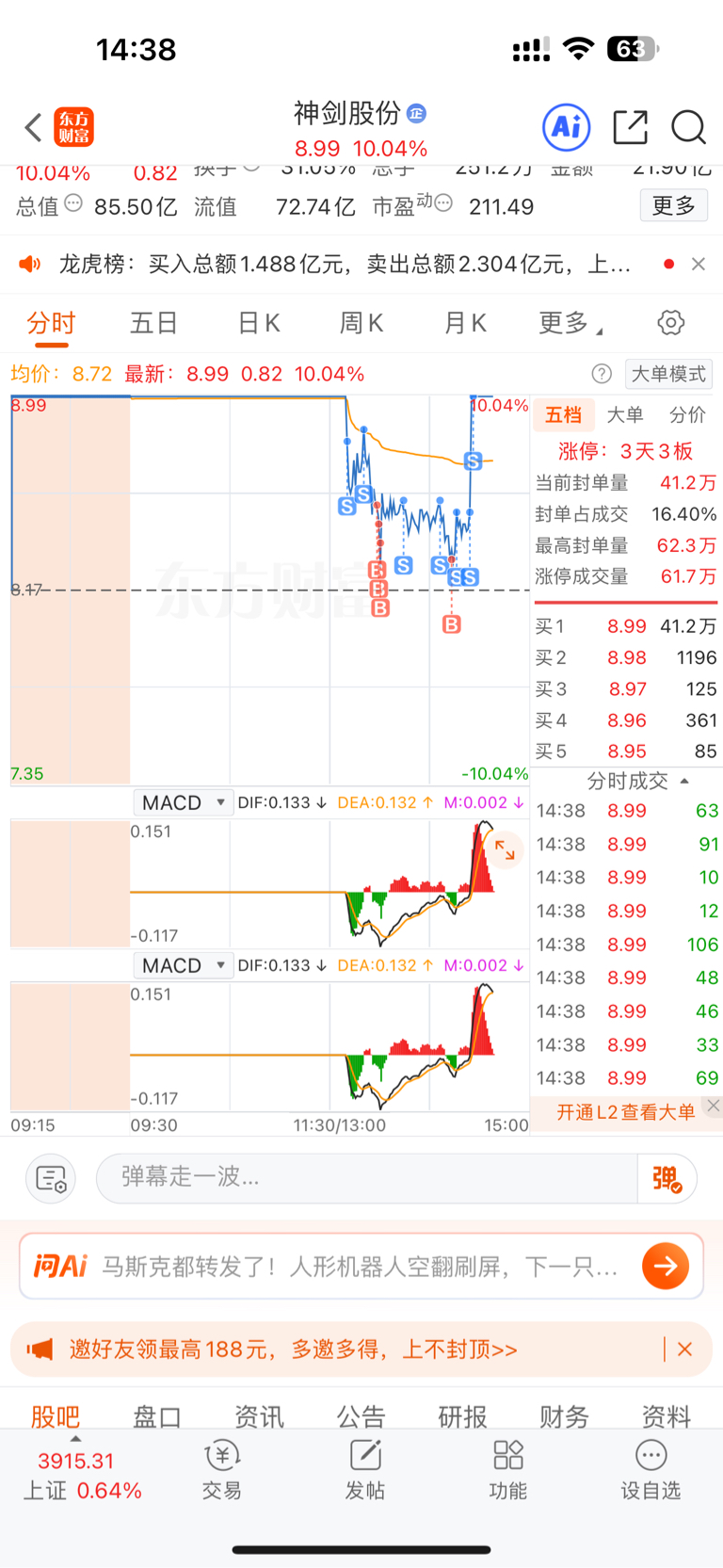 这票短时间到头了上周三我20.7左右卖掉还有人说我韭菜我出了这个满仓神剑股份爽歪