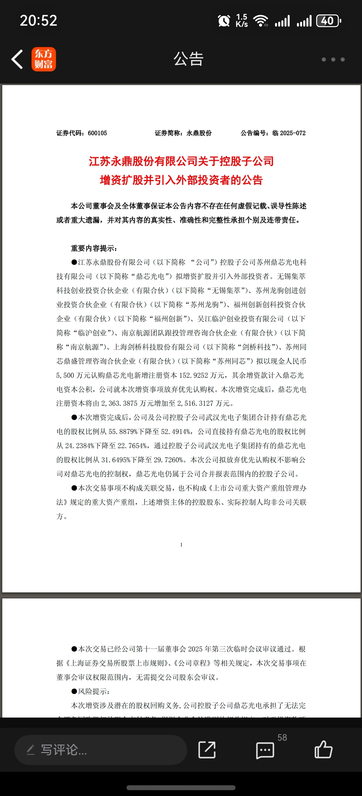 $永鼎股份(SH600105)$ 结合这个公告我做个大胆预测,永鼎实际上是有很强的科创属性的,科创板更利于他的生长,但永鼎上的主板,据我所知目前也没有主板转板科创的通道(建议zjh可以研究让符合条件的主板企业转板科创)。因此这个公告隐含的下一步策略必然是分拆上市,而且我完全确信是上科创板,立字为据。