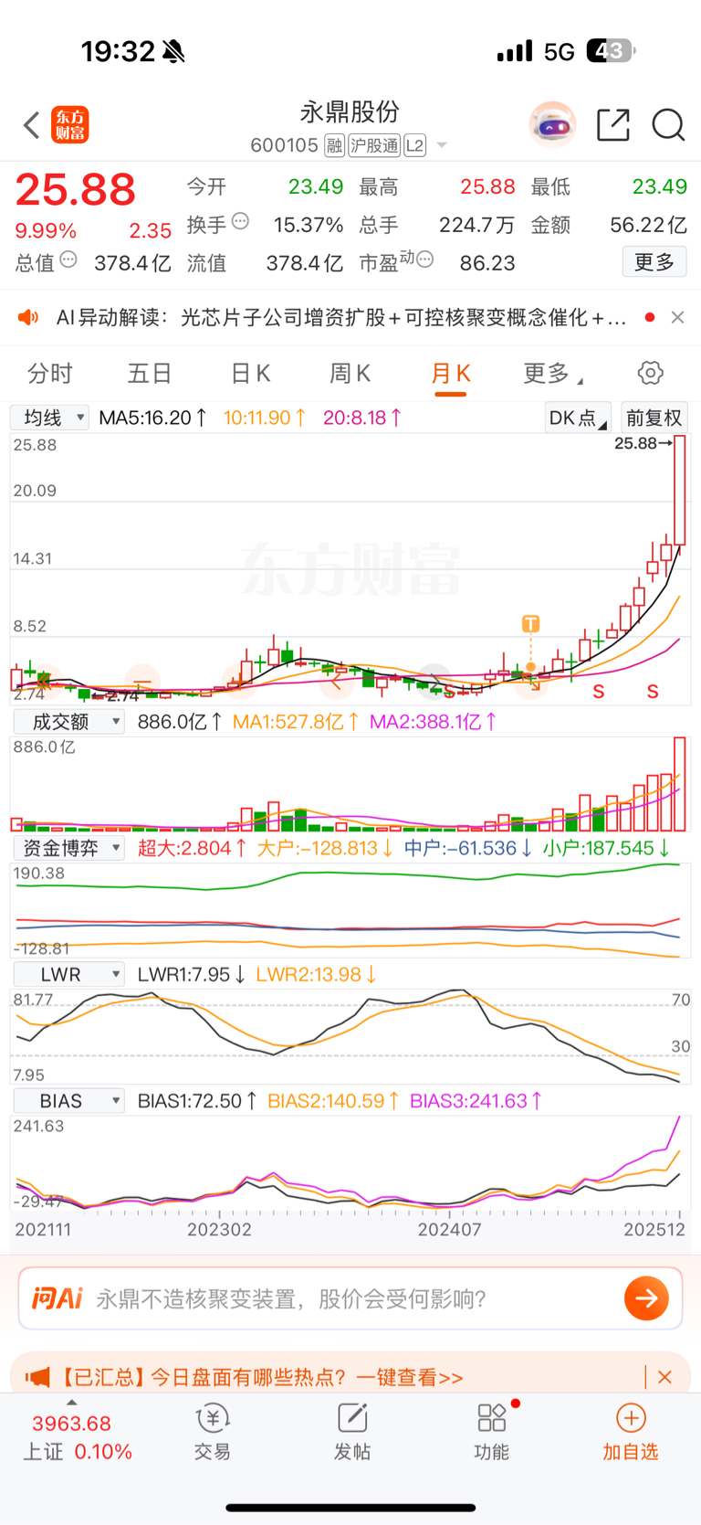 今年1月份买的,吃了个涨停,1月8号卖掉就删自选了,今天一看,不得了,不得了,吴