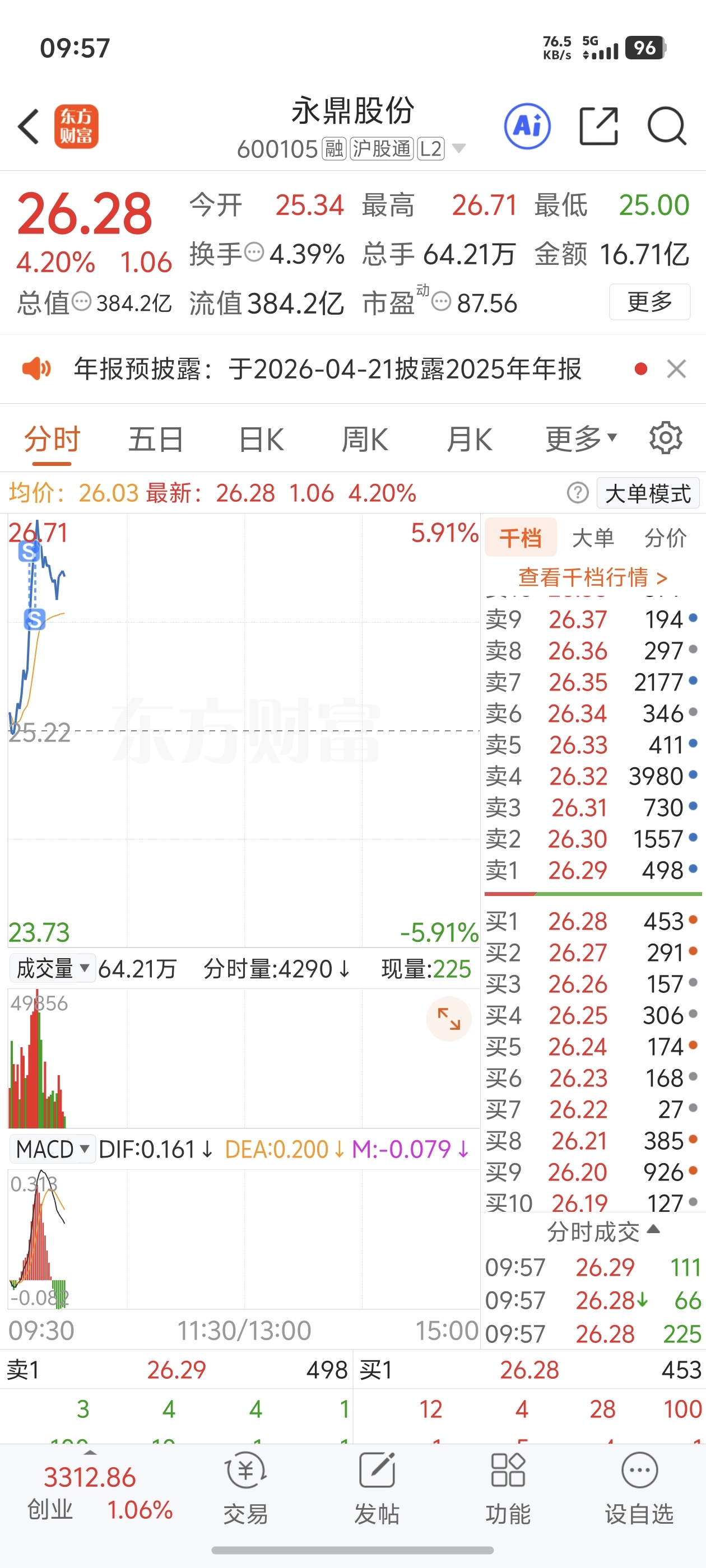 $永鼎股份(SH600105)$ 兄弟们26.33高抛了。吧昨天25加仓到抛了。底仓不动。高抛低吸