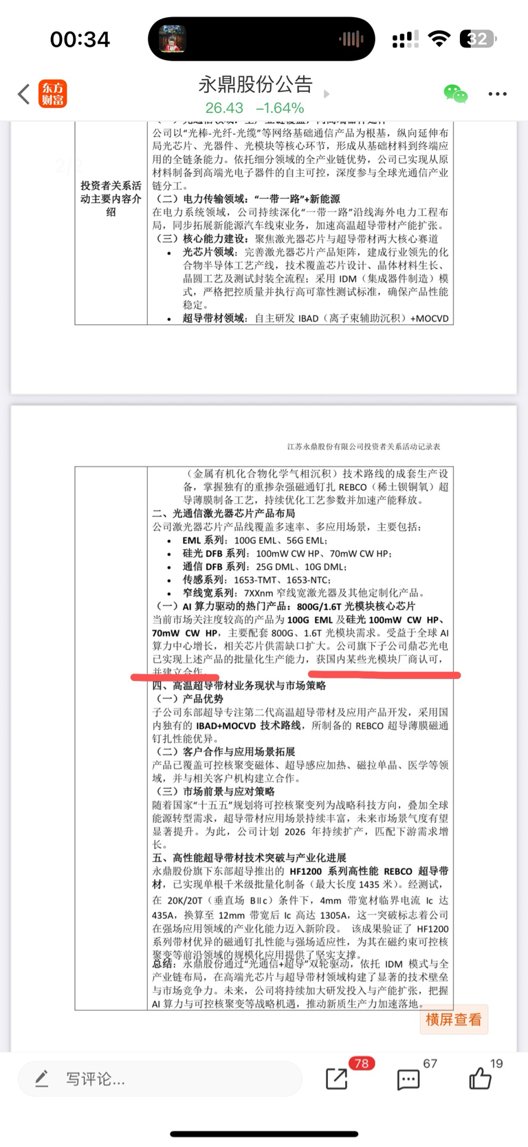 $永鼎股份(SH600105)$ 光芯片紧张,26年上半年供不应求,其次是涨价,随着1.6T 光模块放量,中际旭创自研的 CW 硅光也不够使用,导入了其他供应商链,结合之前的研报和板哥的分析,几乎都一一验证,永鼎股份在投资者关系活动中也表态过,1公司的产品已导入光模块厂商战略协议中