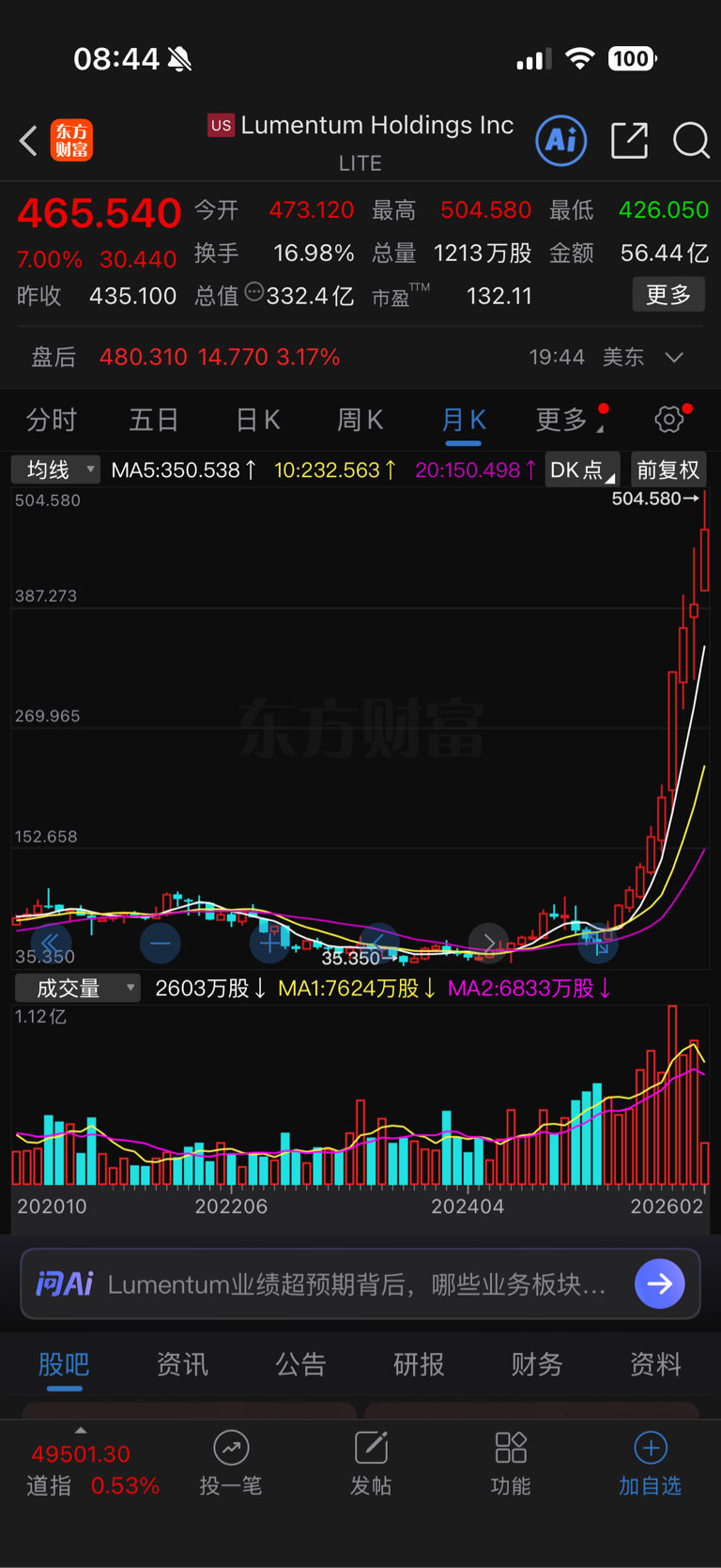 $永鼎股份(SH600105)$ 你们看什么英伟达,看光模块啊,美股的光模块老大LUMENTUM,昨晚大涨7%