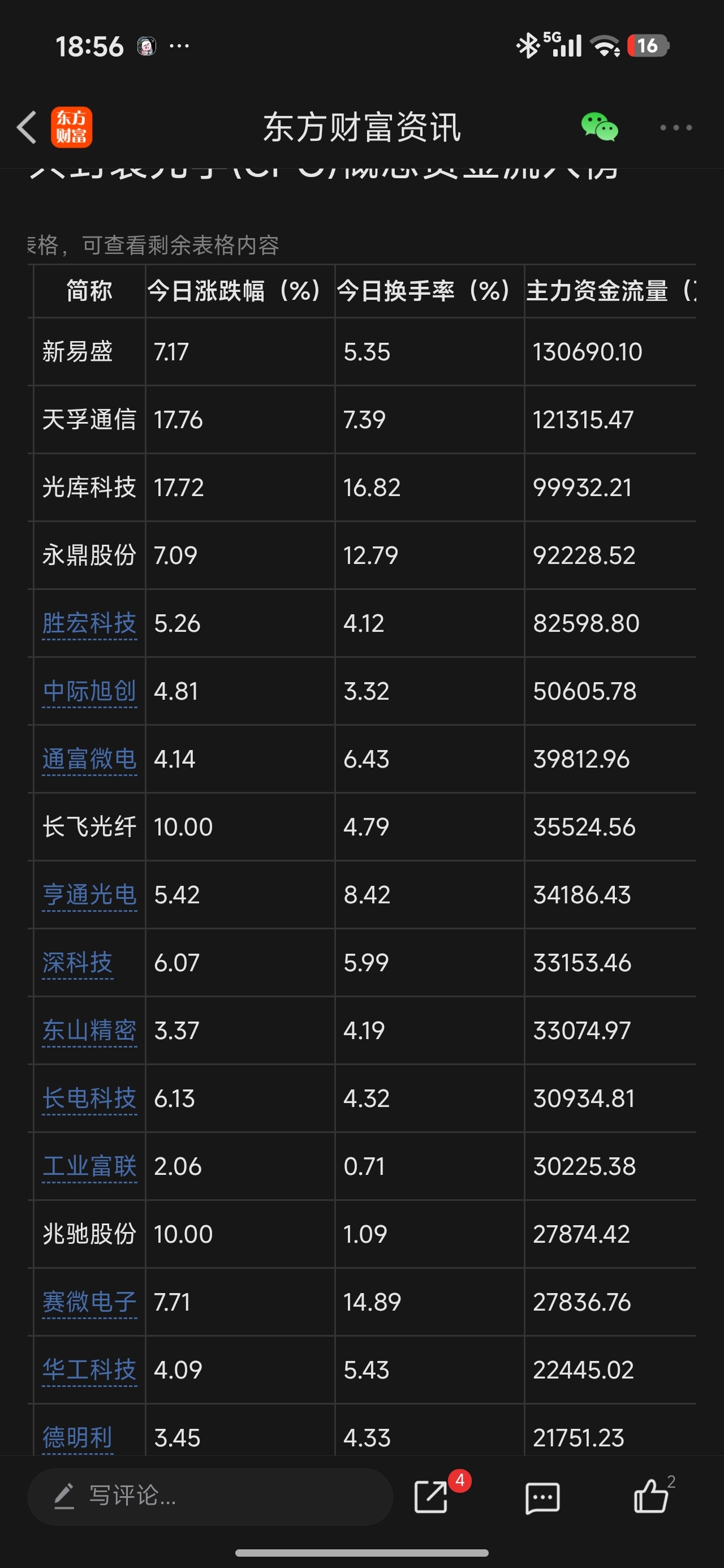 $永鼎股份(SH600105)$ CPO流入前四结果没涨停