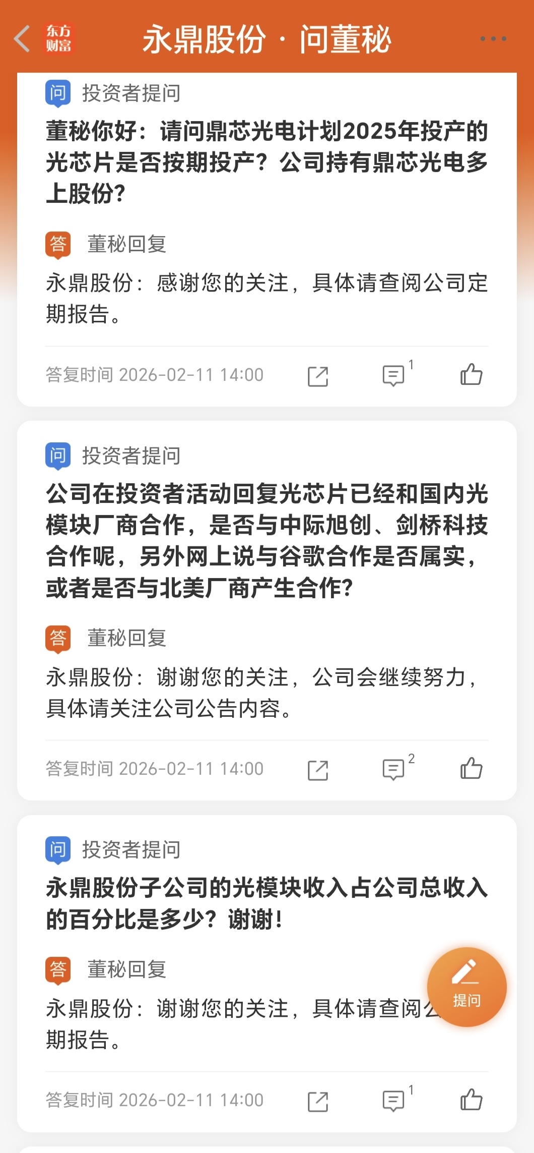 $永鼎股份(SH600105)$ 从2023年开始这个董秘的回答就一直遮遮掩掩,可以证明这一家私人公司并没有真正的光通信产品而是一个地地道道小线缆公司企业,然后被一些急于贷款找人担保的光通信小作坊企业挂靠人,被资本包装常年净利润处于亏损边缘,中际,汇绿真有实质的东西的董秘就敢回答,像这样没有实质的东西靠炒作的企业董秘回答多半是遮遮掩掩,,,,