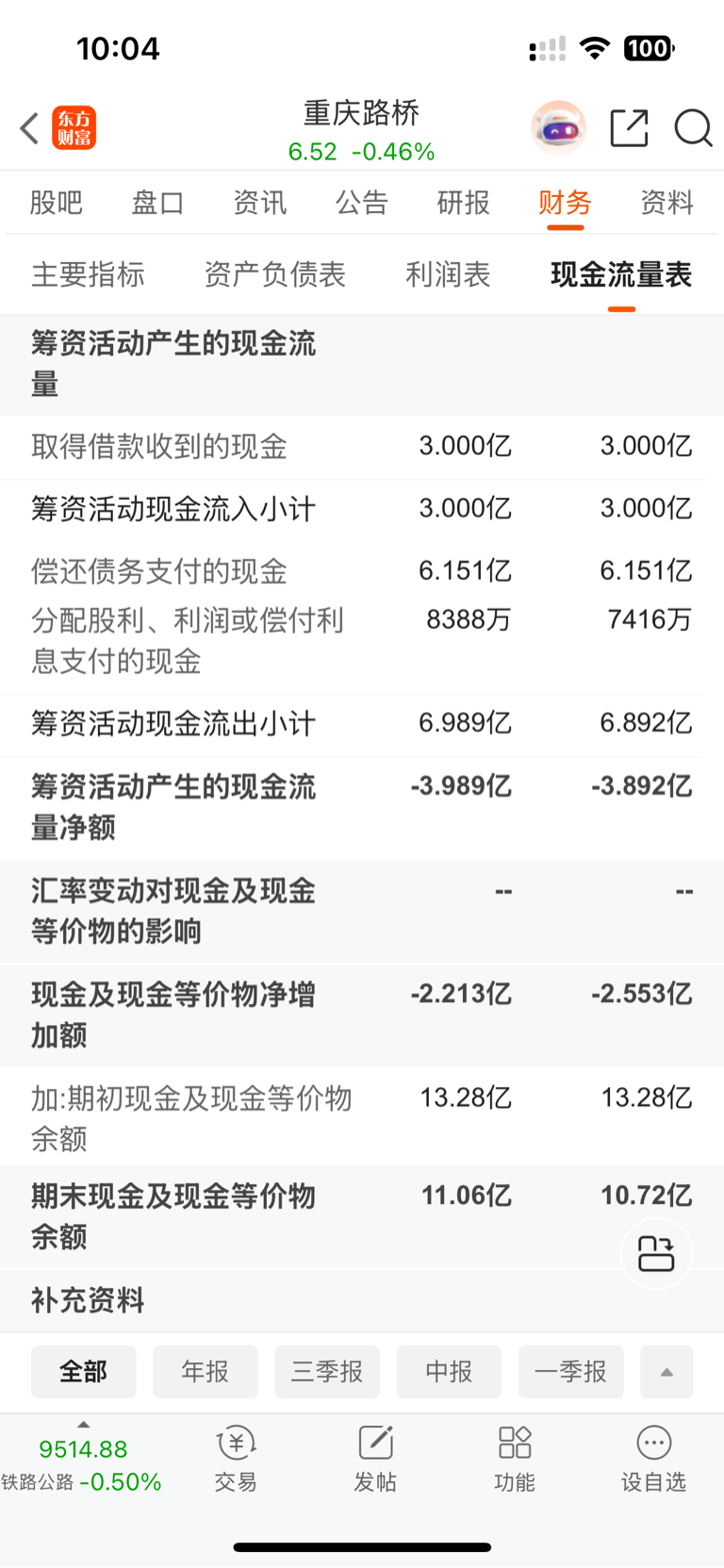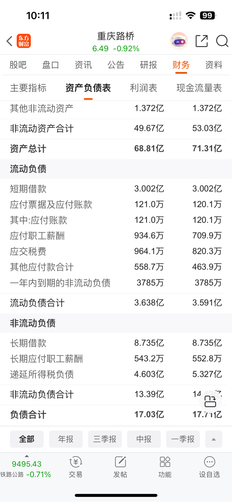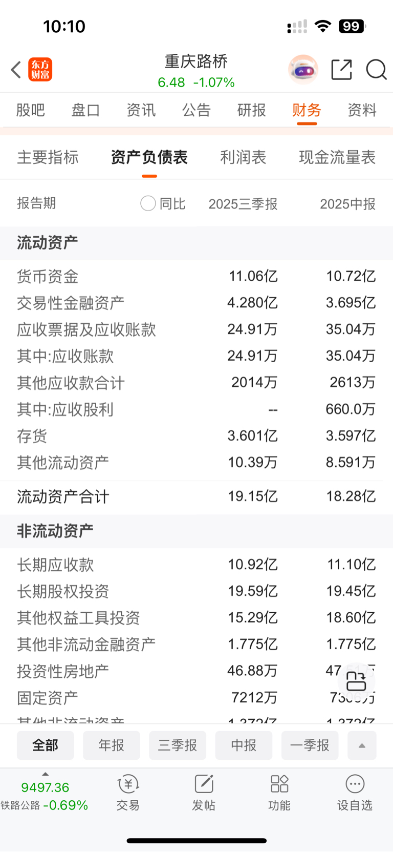 $重庆路桥(SH600106)$ 好消息:重庆路桥2025年3季度货币资金11.06亿,负债率24.7%,现金流充裕,公司转型有保障!大家自己多研究上市公司报表,才能心中有数,不会被有心人误导