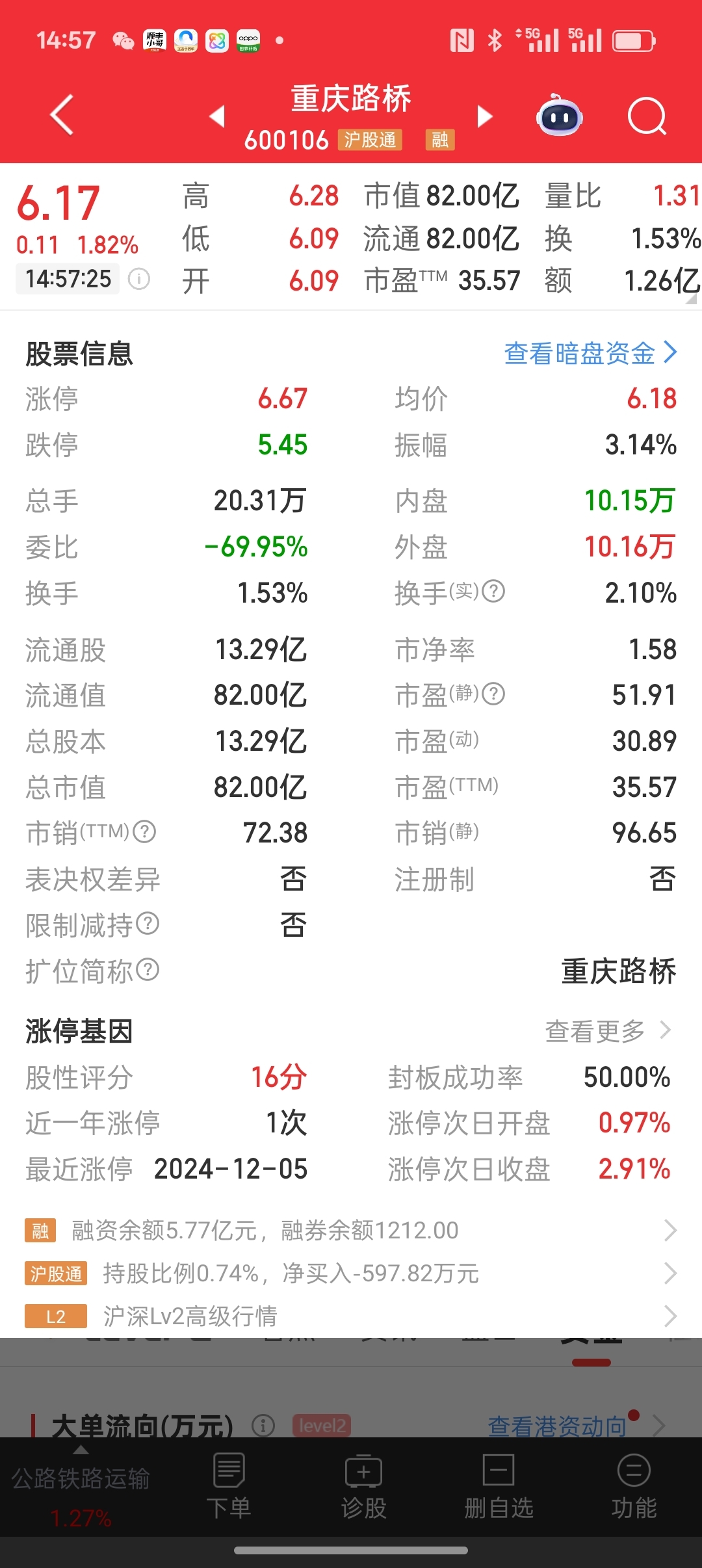 $重庆路桥(SH600106)$ 绝对控盘,57分内外盘一样