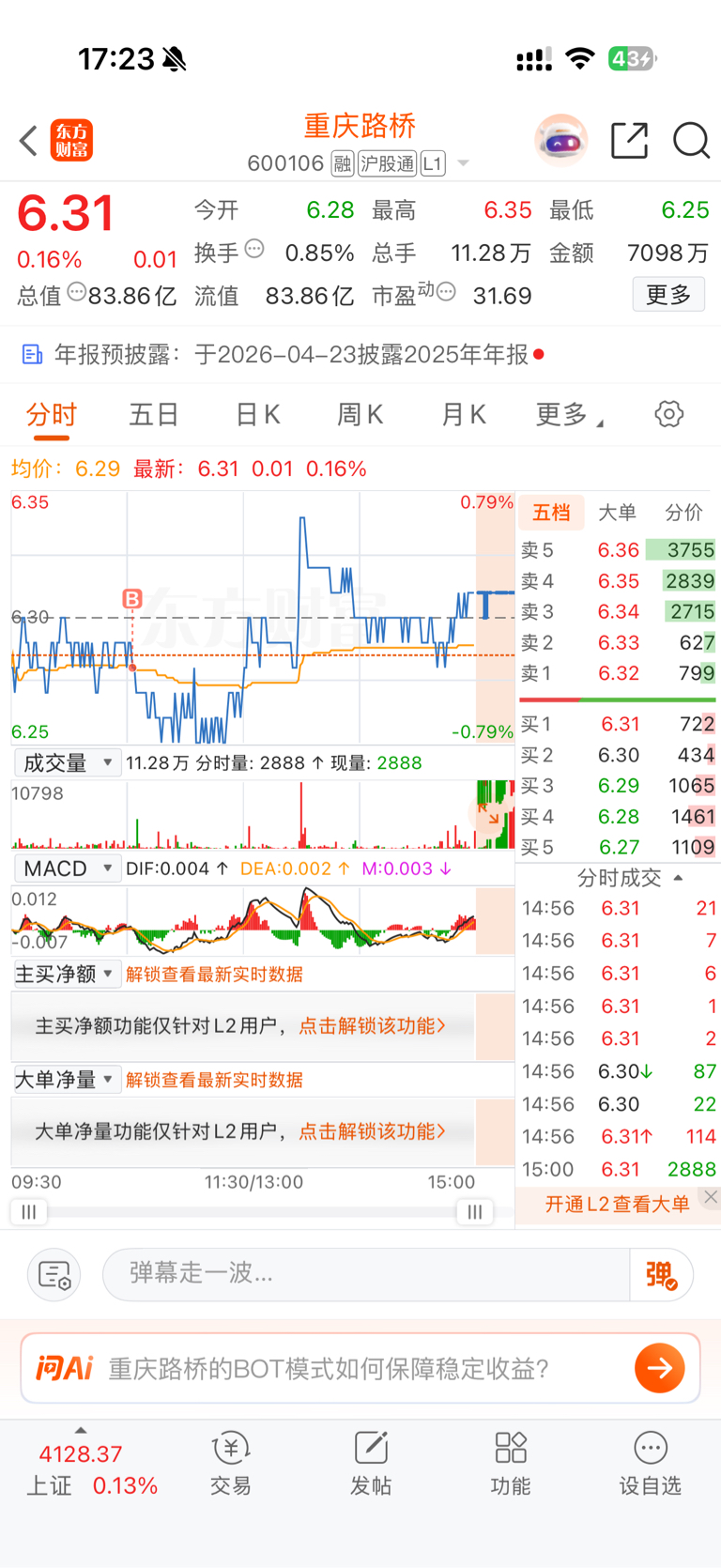 $重庆路桥(SH600106)$ 重新建仓重庆路桥。