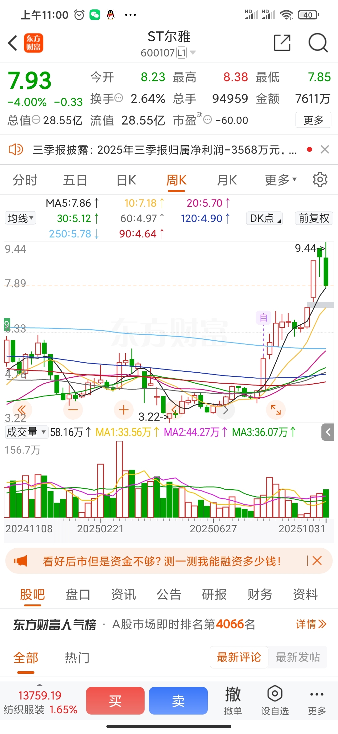$ST尔雅(SH600107)$ 调整三周