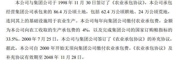 北大荒招股说明书关于在2048年以前向母公司免费承包土地的协议截图: