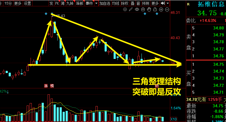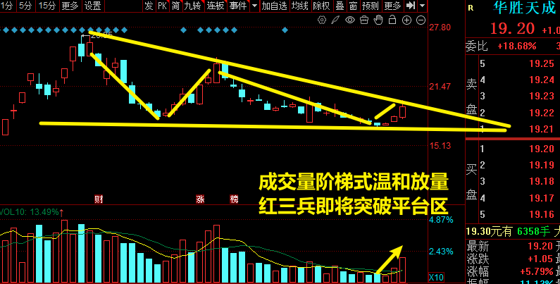 股价走的是一个标准的三角形整理结构,最近三个交易日收出了连续的小阳线,在我们的K线理论中,有个专业的名词,叫做红三兵。而且成交量阶梯式温和放量,主俚稳扎稳打,高度控盘中,如果今天周三能够强势突破平台上沿,很有可能走出新的独立行情,盘中有机会的话,我也会实时在留言区讲。