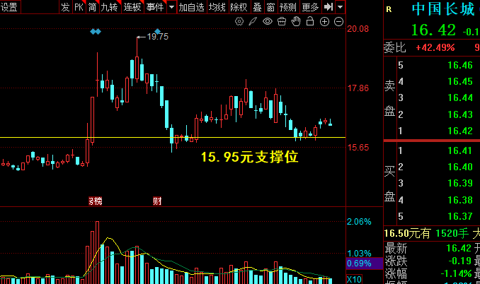 长城盯死下方15.95的支撑位就可以了,近期连续的小阴小阳线,主俚在西筹洗盘,在车上的朋友拿稳拿好,这里一旦放量将会有加速的行情,没在车上的朋友,可以等待股价回踩15.95支撑线去低西。