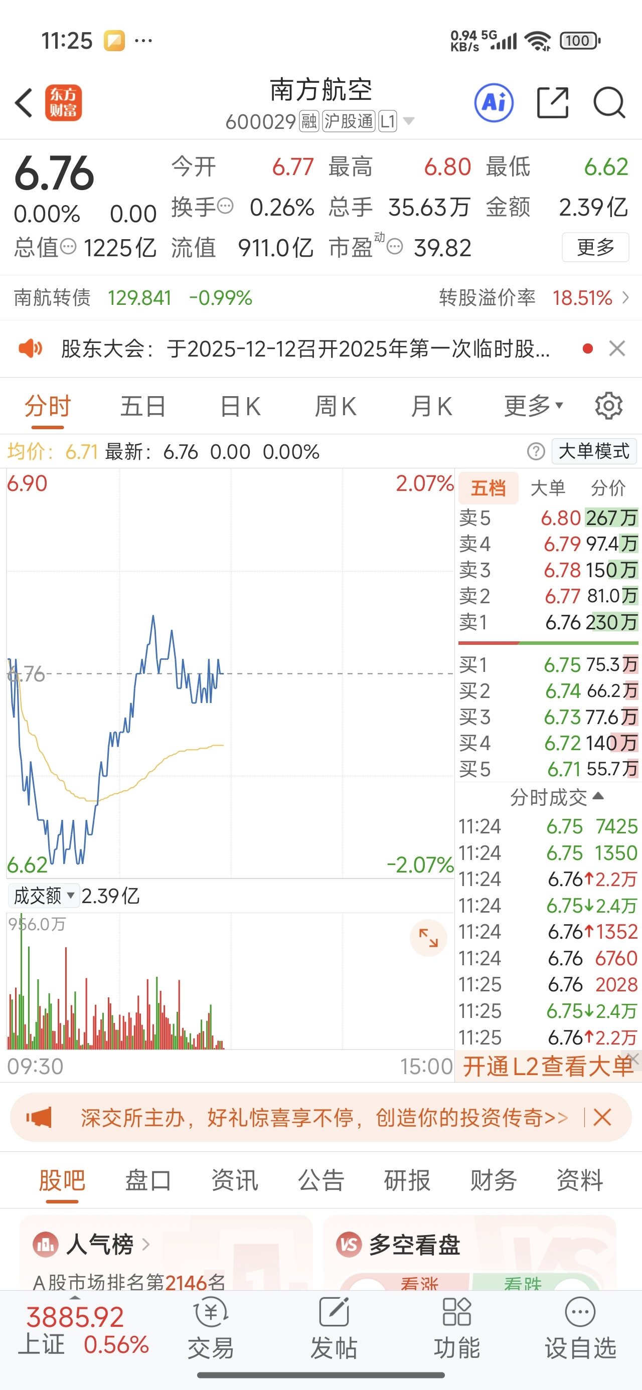 南方航空900多亿的流通市值,买卖挂单每档两三百万。