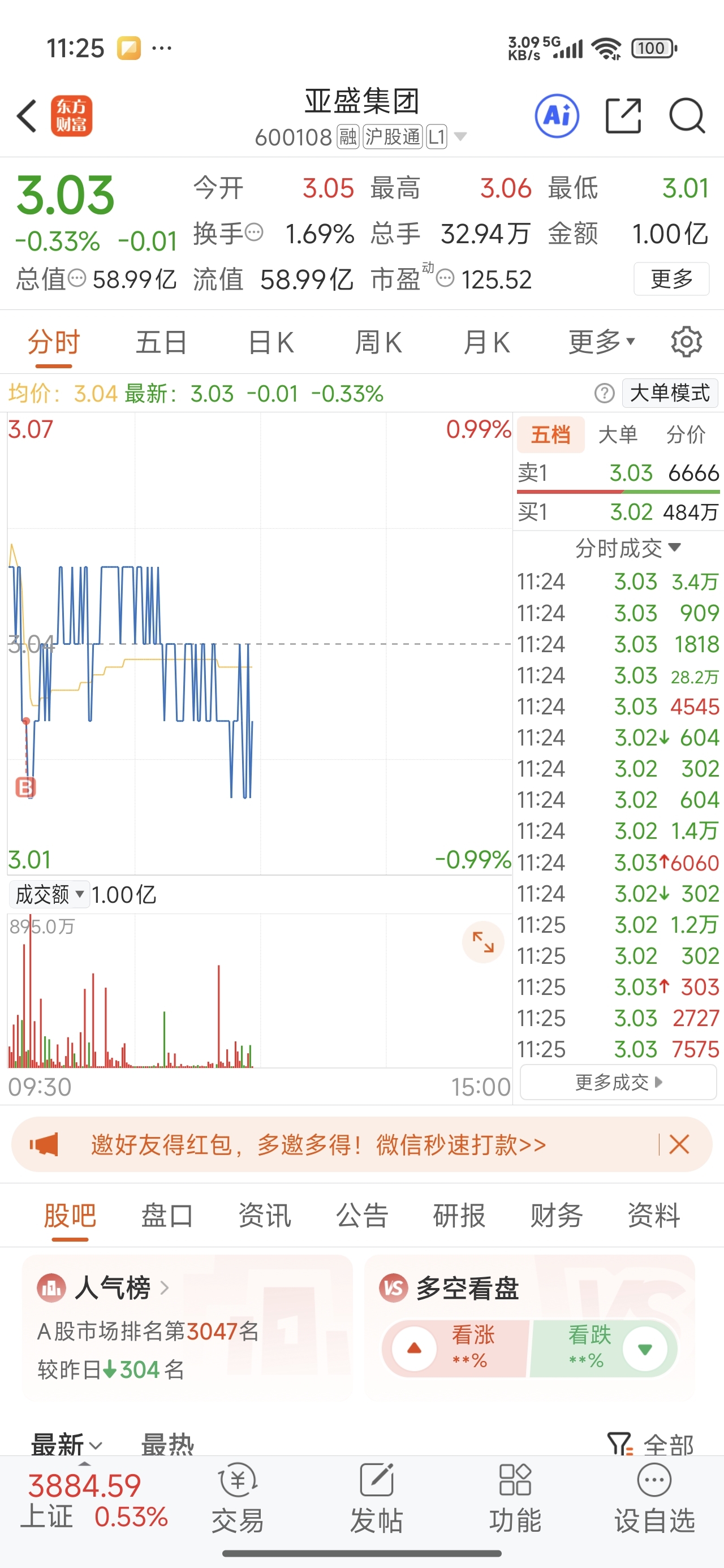 亚盛集团不到100亿的流通市值,买卖挂单每档三四百万。