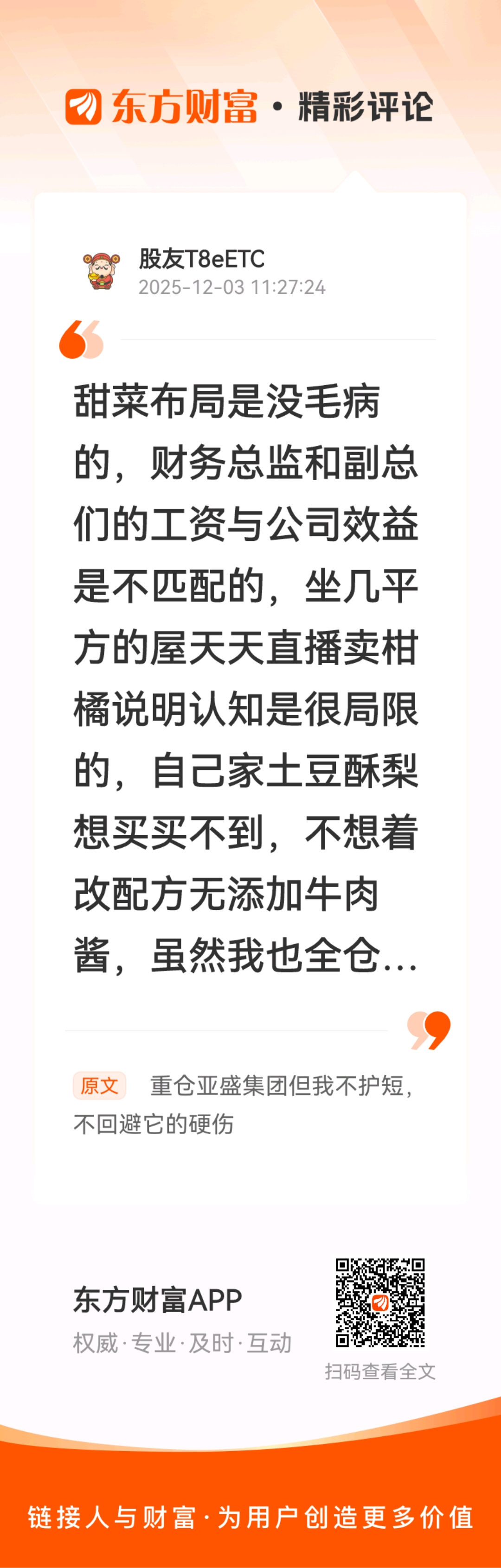 //@股友T8eETC :甜菜布局是没毛病的,财务总监和副总们的工资与公司效益是不匹配的,坐几平方的屋天天直播卖柑橘说明认知是很局限的,自己家土豆酥梨想买买不到,不想着改配方无添加牛肉酱,虽然我也全仓仅此亚盛