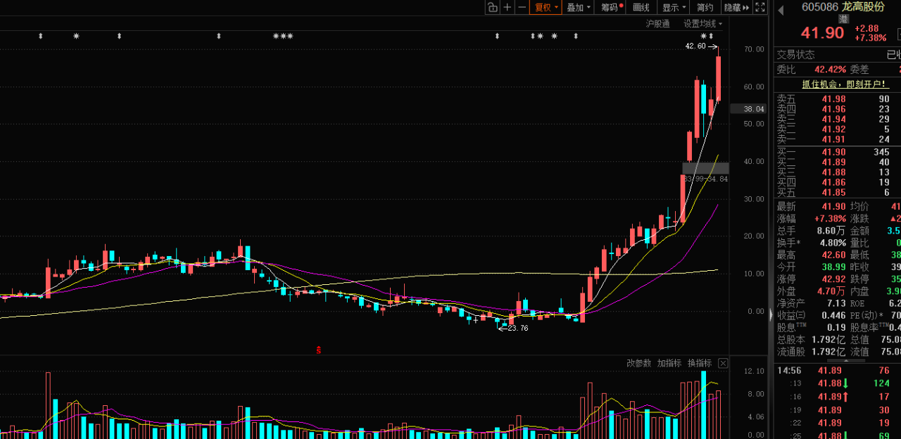 龙高股份605086:海峡概率以及非金属材料,板块在昨天超预期,而他选择低开就存在预期差,加上这一波主升以来它都是沿着5均上升的,所以短期只要不是破线的话基本上还能看看。