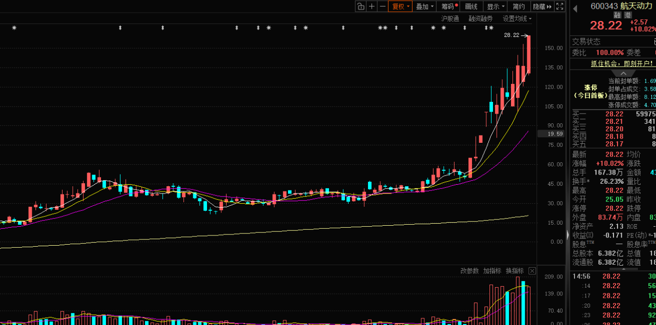 航天动力600343:商业航天概念,比较有辨识度的人气标,而且是充分换手上来的,看看今天有没有板出现,只要不是放量诈板基本就问题不大