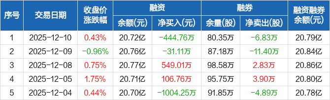 国金证券融资融券信息显示,2025年12月10日融资净偿还444.76万元;融资余额20.72亿元,较前一日下降0.21%。