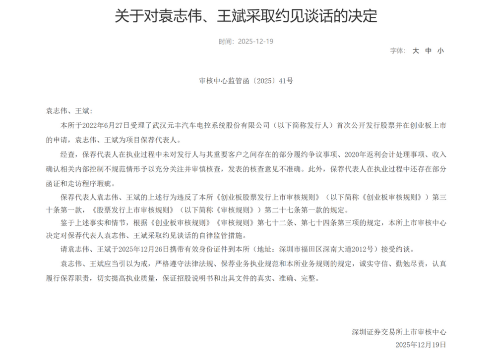 无独有偶,深交所也于同日对2名保代开出罚单。银河证券袁志伟、王斌为创业板IPO元丰电控项目保代,因存在发表的核查意见不准确、部分函证和走访程序存在瑕疵,最终被采取约见谈话的自律监管措施。