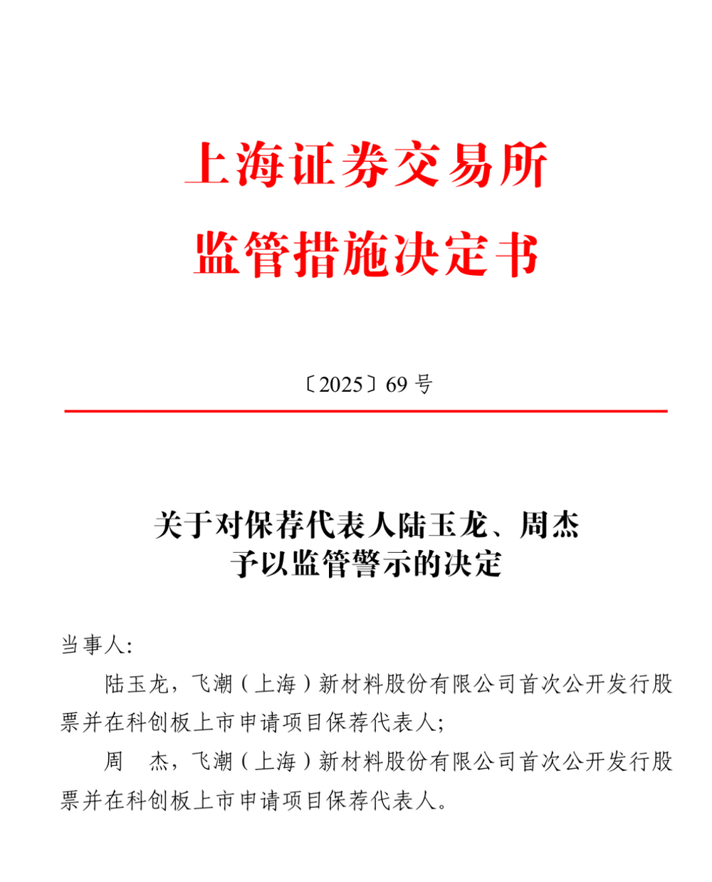 12月19日,上交所对科创板IPO飞潮新材出具罚单。发行人作为信息披露第一责任人,因存在相关违规情形,导致相关财务数据、 独立性、关联方信息披露不准确,履行信息披露职责不到位,而国金证券陆玉龙、周杰作为项目保代,对发行人相关违规情形存在保荐职责履行不到位的情况,因此被予以监管警示。