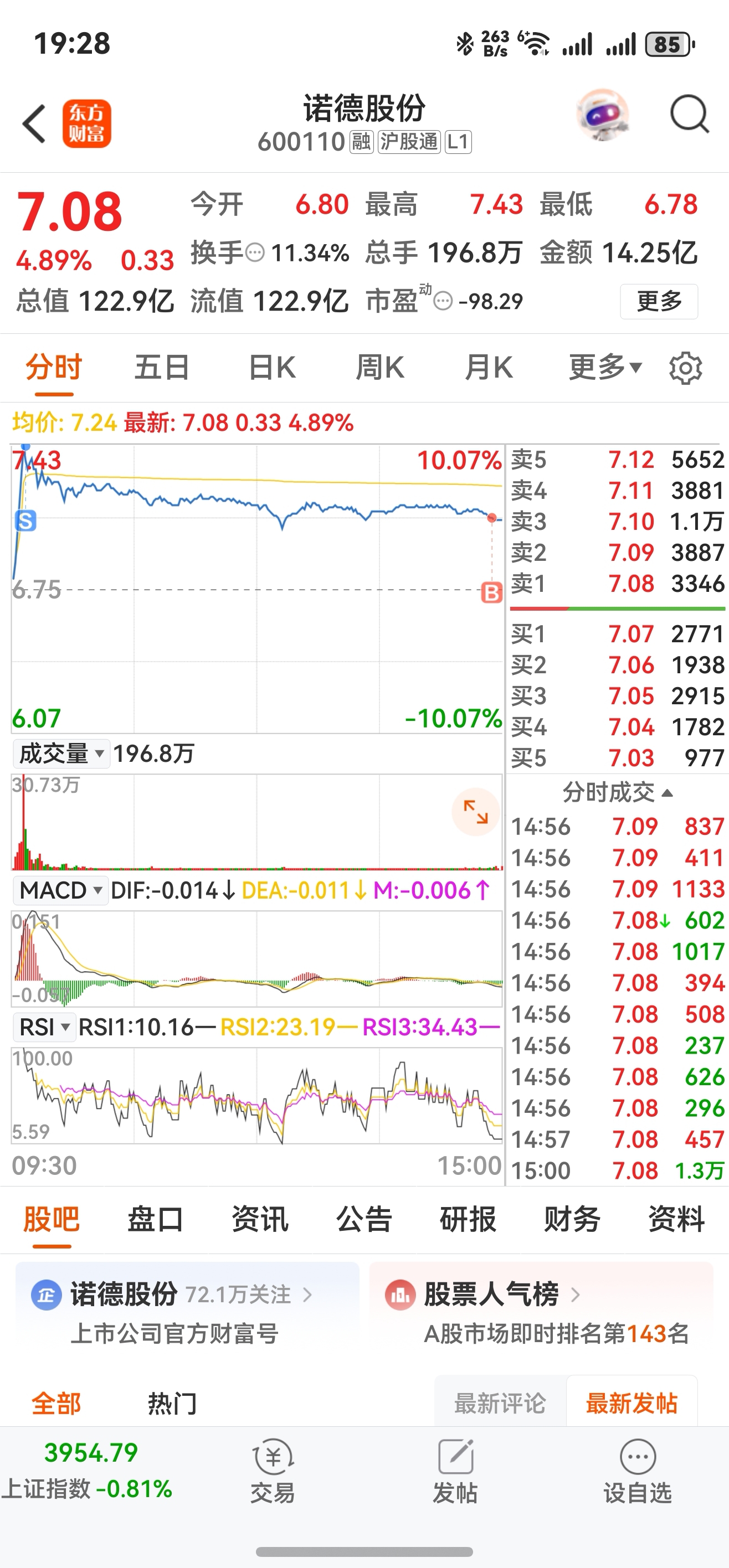 $诺德股份(SH600110)$ 满仓清空.尾盘709二成仓接回.周一看多!