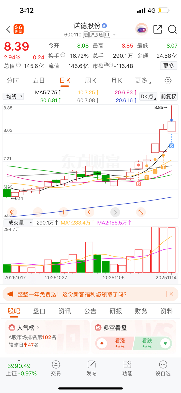 $诺德股份(SH600110)$ 下周回调在上车 如果高开那就卖飞