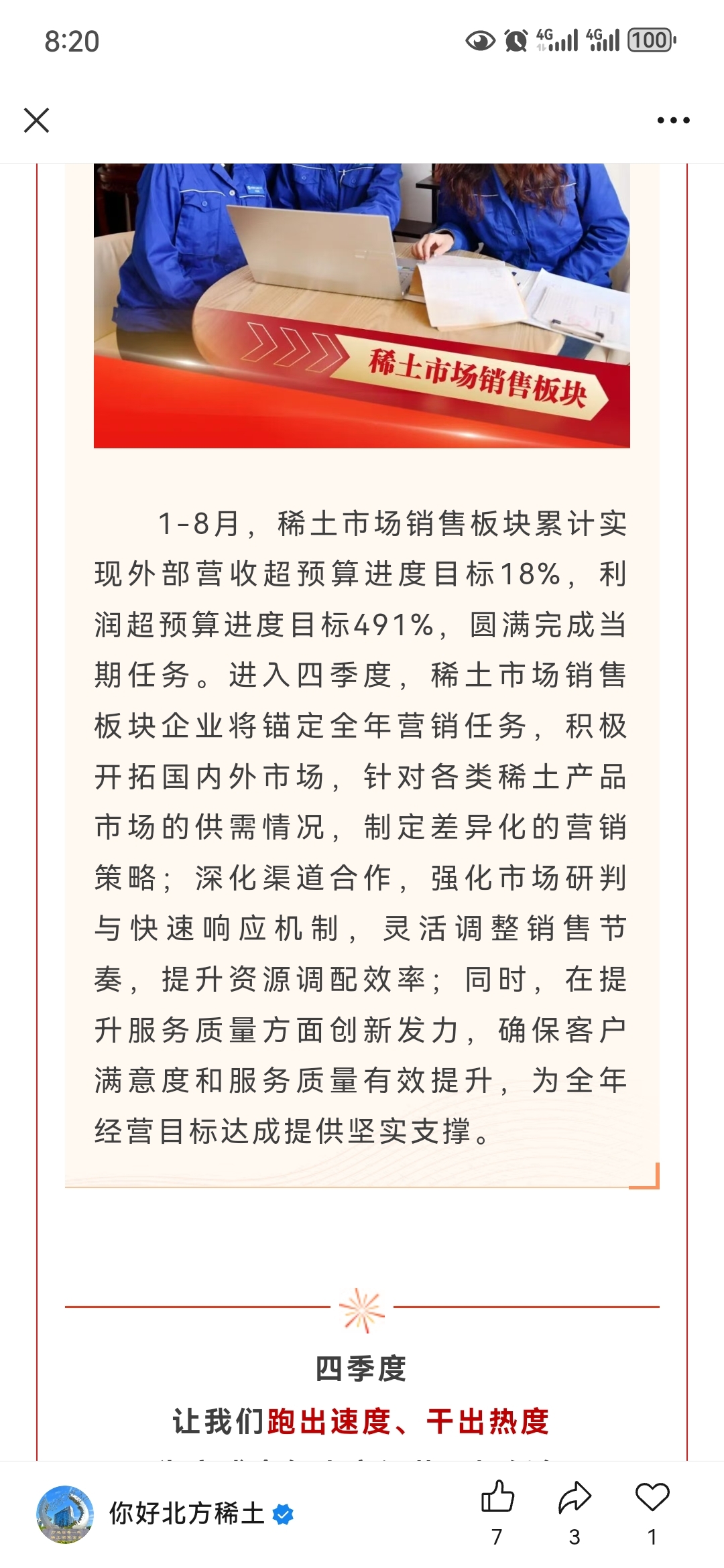 $北方稀土(SH600111)$ 1-8月利润超计划4.9倍。