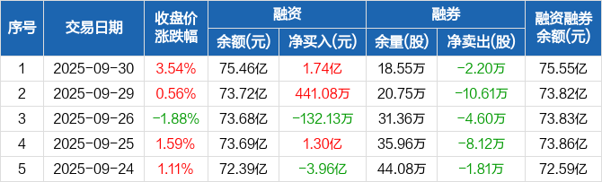 北方稀土融资融券信息显示,2025年9月30日融资净买入1.74亿元;融资余额75.46亿元,较前一日增加2.36%。