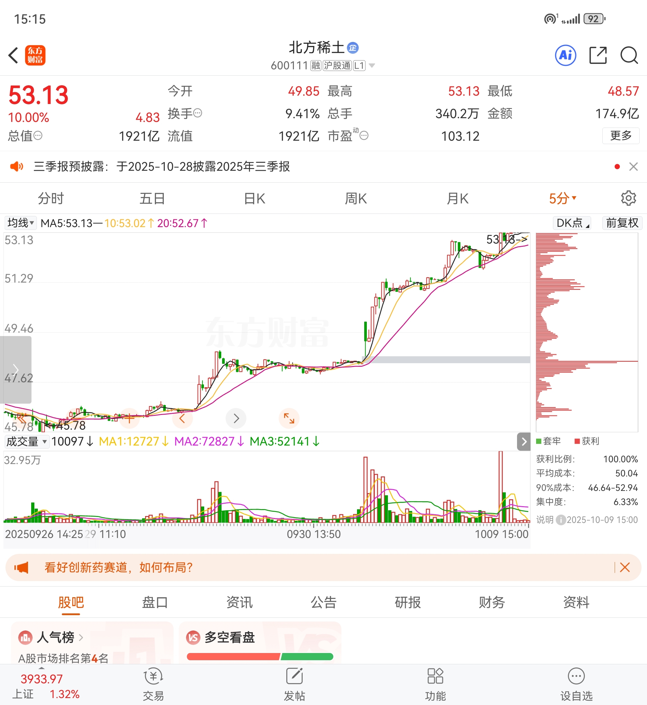 北方稀土目前趋势向上,短线防守52.3,49.7,49.1这些点位。