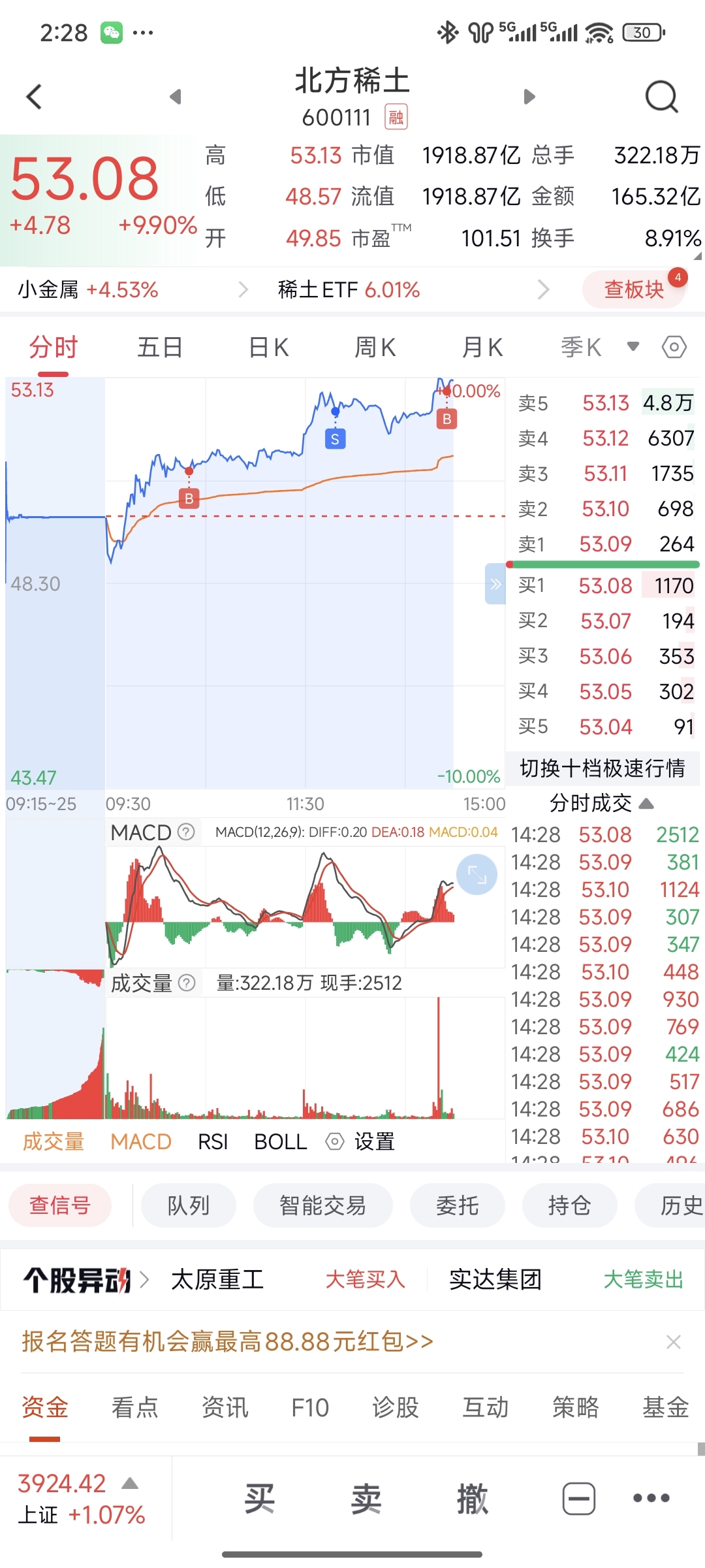 $北方稀土(SH600111)$ 就想知道今天那个13亿是谁